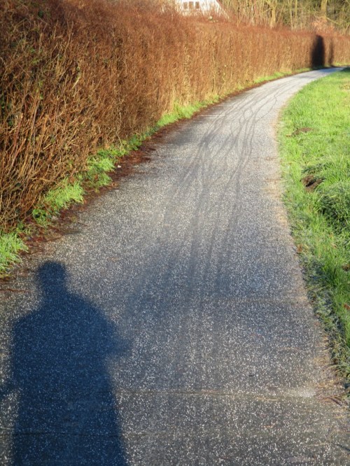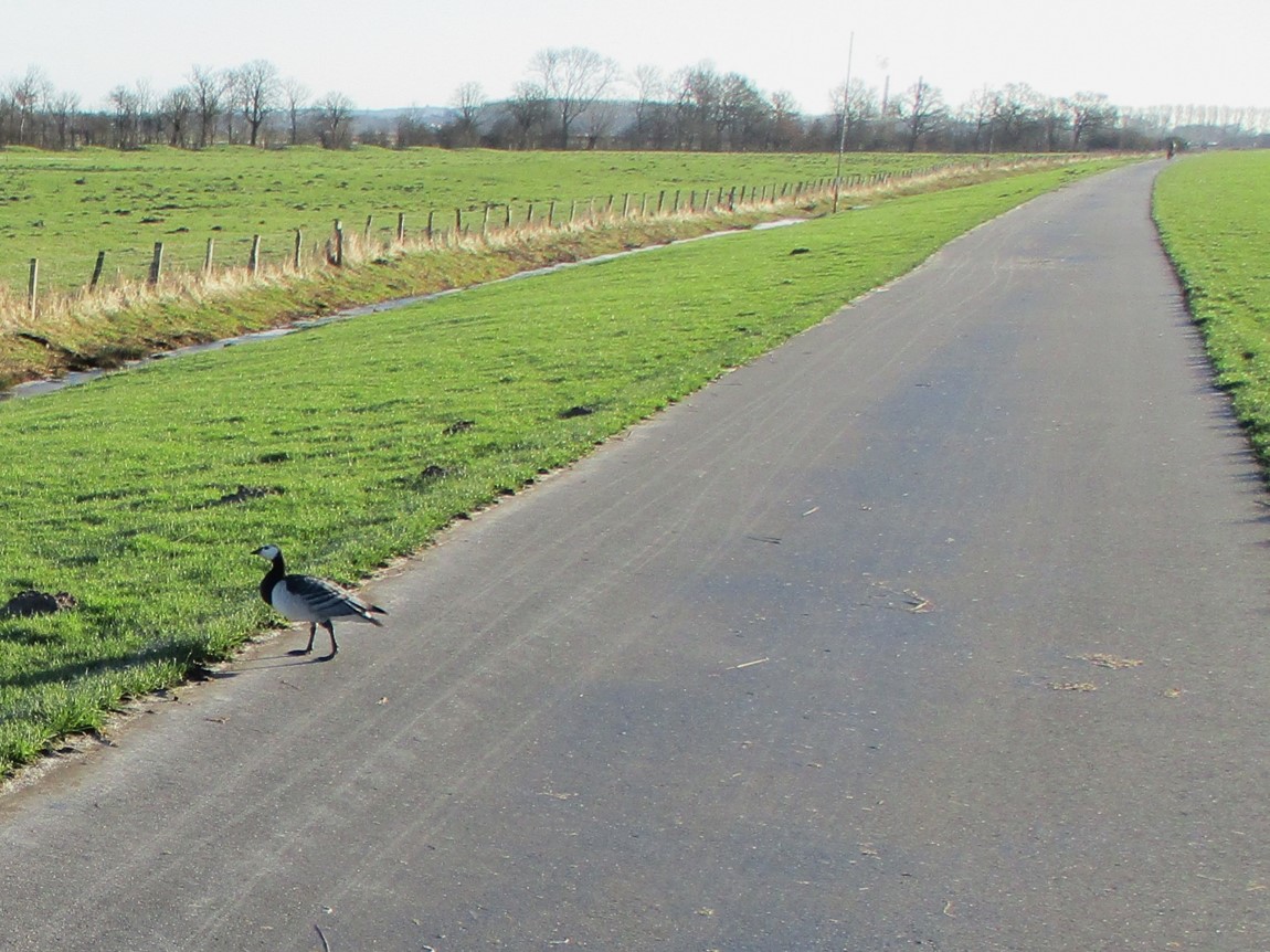 Also nun: Radeln, der Sonne entgegen. – Zu Fuß ist hier (wieder einmal) eine Nonnengans allein unterwegs.