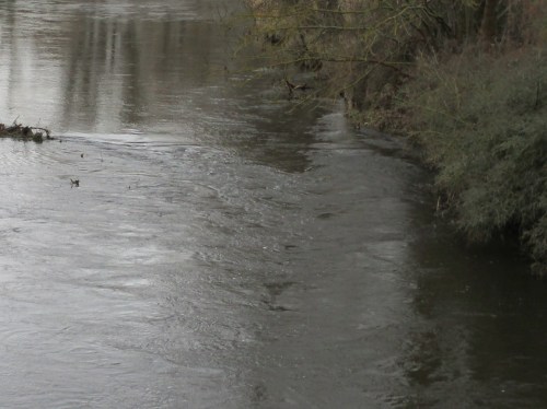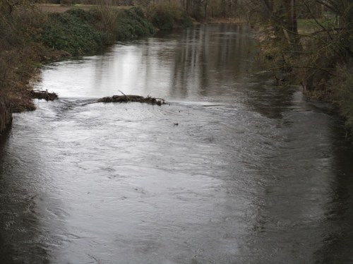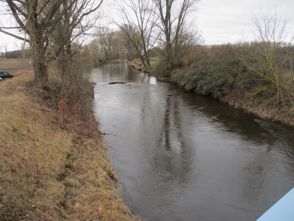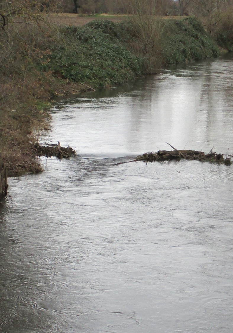 Zu erkennen sind die durch Wasserkraft veränderten beiden Kieszugaben, unmittelbar an der Brücke sowie querab eines ehemaligen Mäanders.