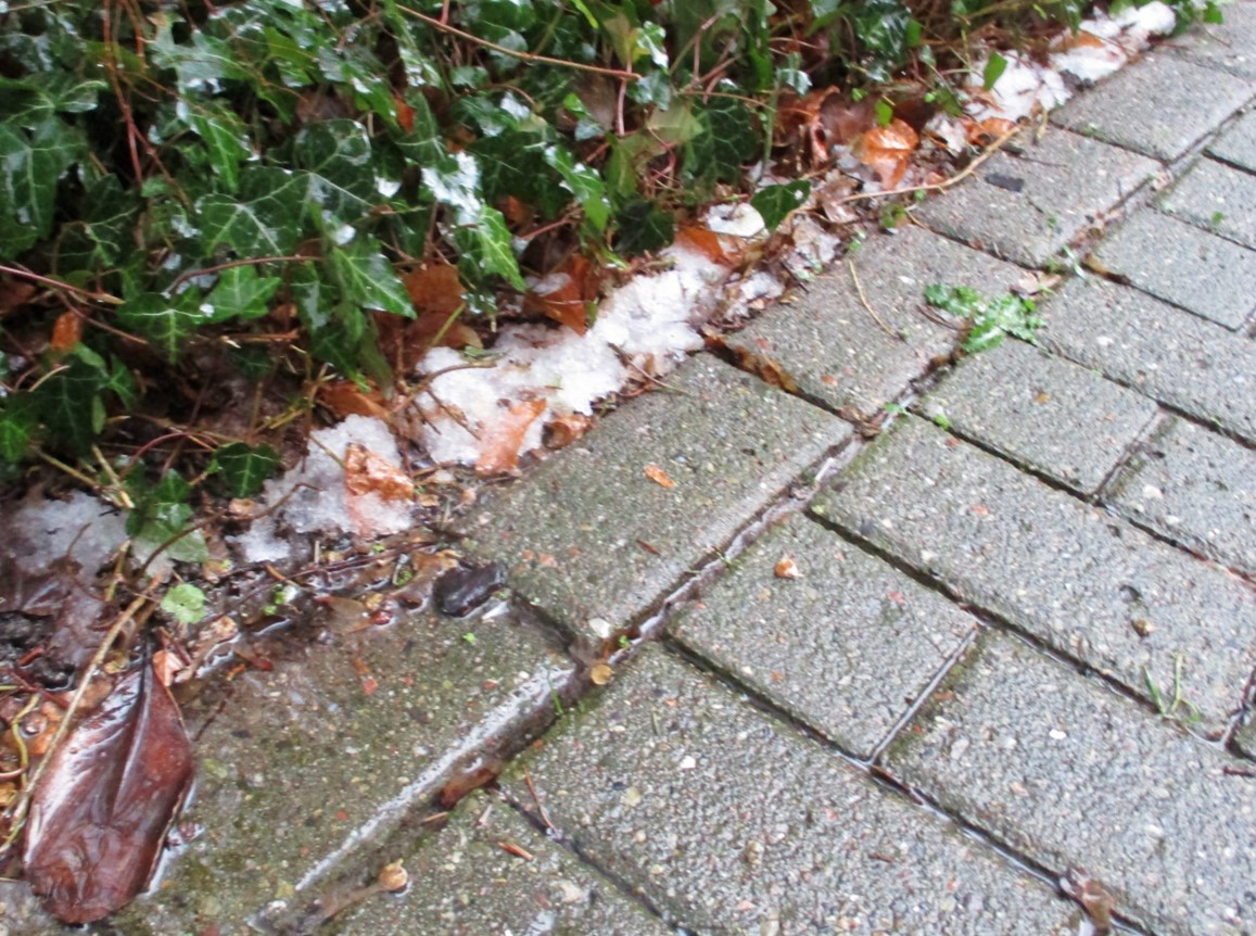 In vorigem und diesem Foto ist anhand weggespülter Laubauflage gut zu erkennen, dass Wasseranheben, Durchfluss durch höhere Ebene und Wasserrückhalt wie beabsichtigt gefördert wurden.