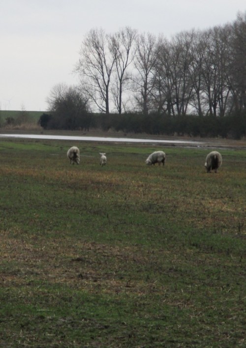 Auf dem Zwischengrün eines nassen Ackers springt seit ein paar Tage das erste von mir gesehene Lamm 2022 herum. (Sollte Vernunft einkehren – und hier wieder Grünland entstehen?)