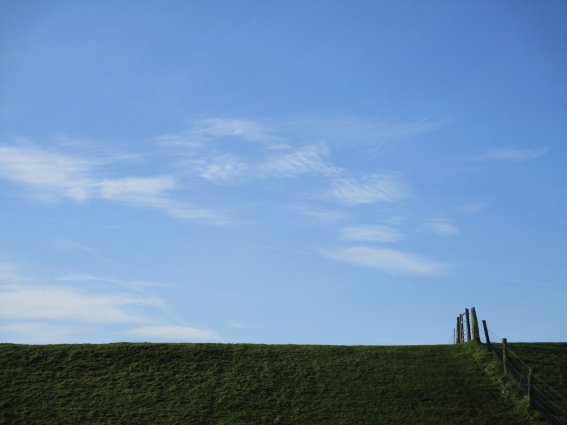 Ich steige die Deichtreppe hoch – Blau-Gelb vor Blau-Weiss.