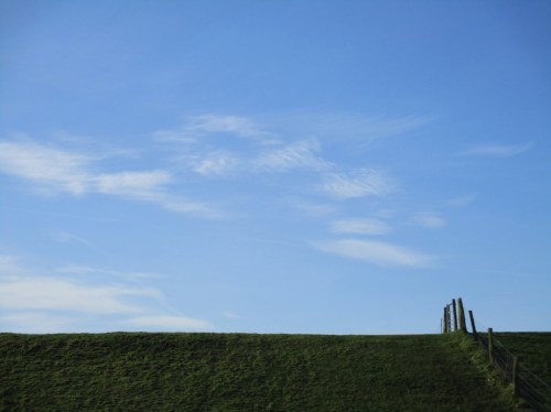 Blick vom Holmer Berg über den alten Elbdeich – Morgensonne und Schattenlagen verdeutlichen Kleinklima.