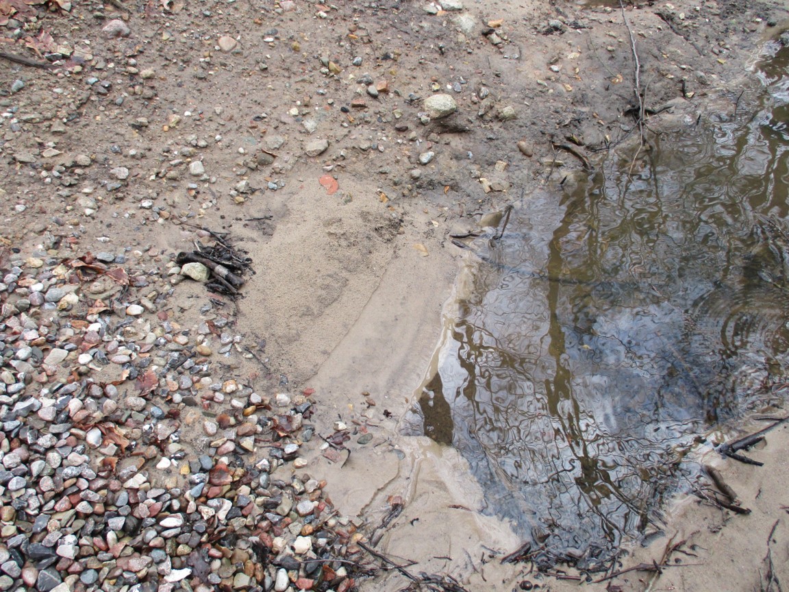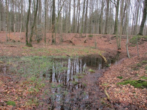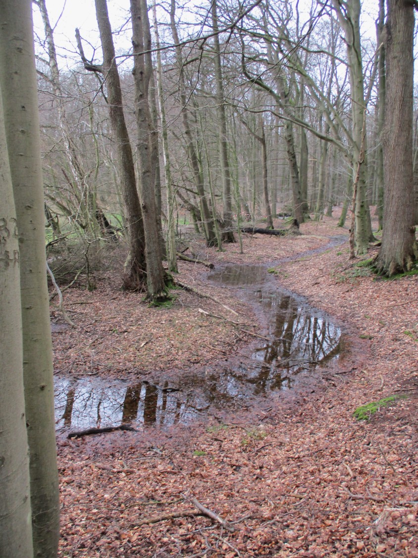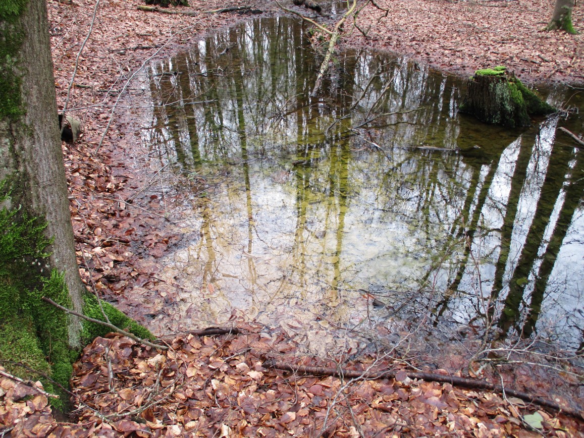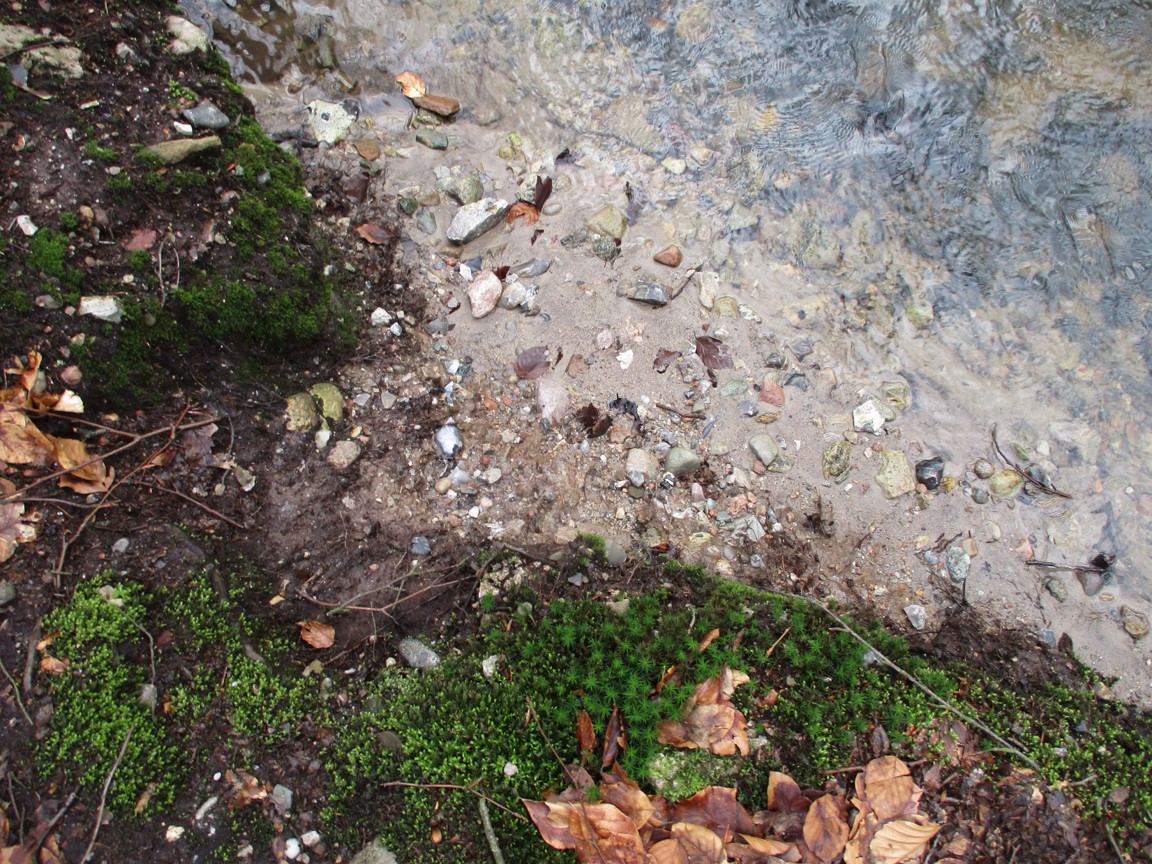 In vorigem und diesem Foto ist anhand weggespülter Laubauflage gut zu erkennen, dass Wasseranheben, Durchfluss durch höhere Ebene und Wasserrückhalt wie beabsichtigt gefördert wurden.