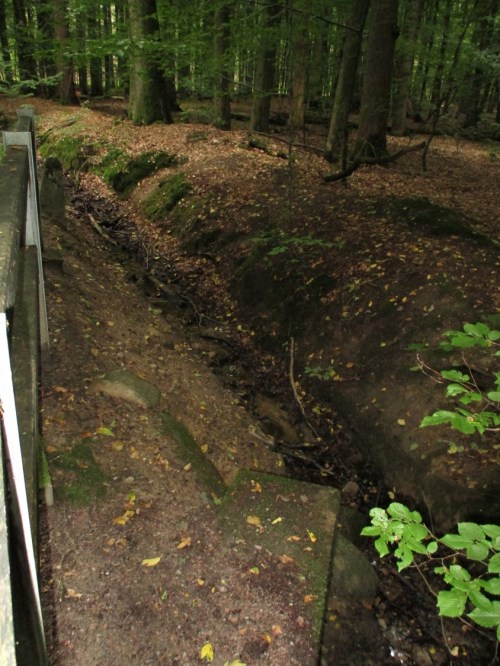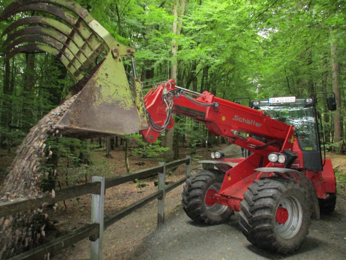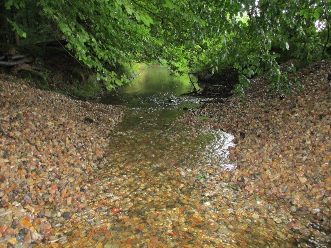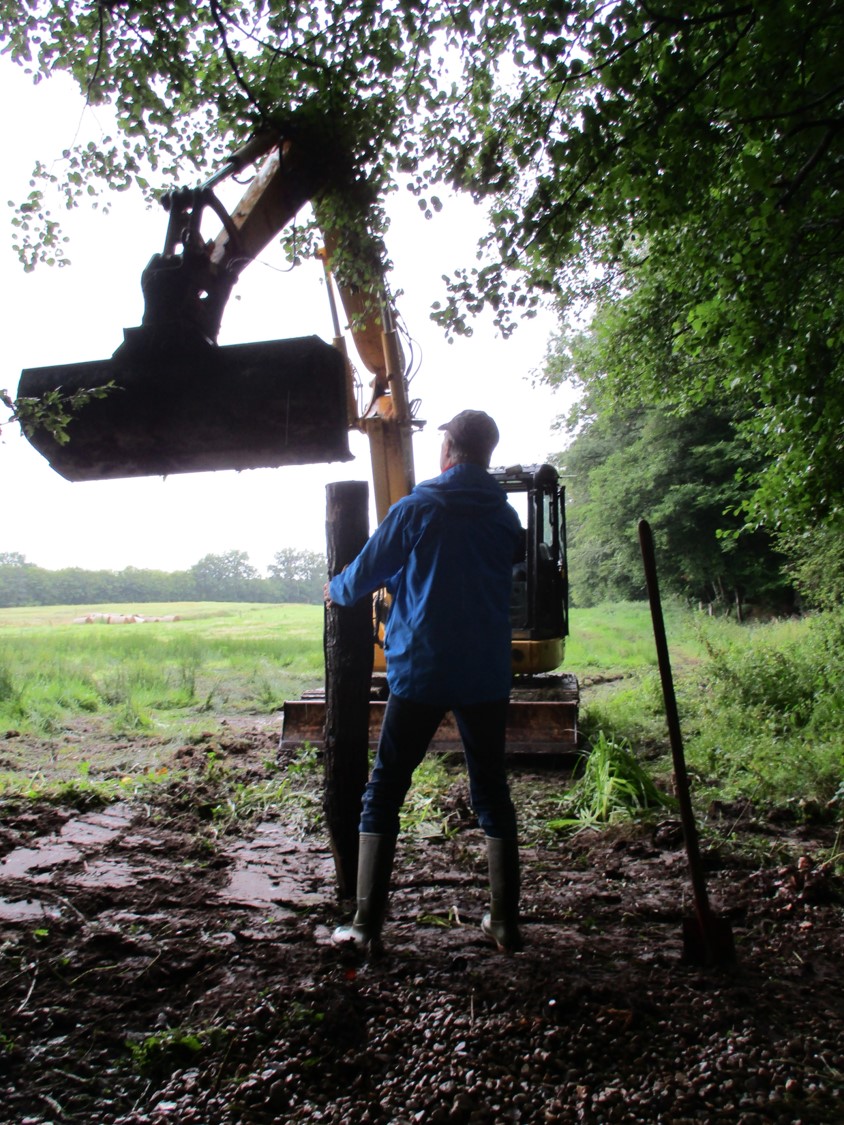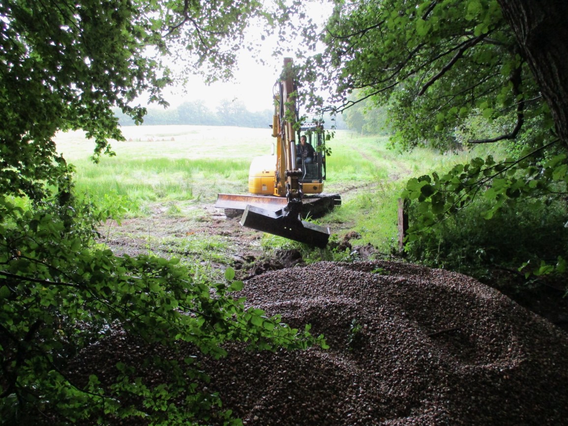 Zum Verbessern und Stützen des Wasserhaushalts im Wald sowie als vom Bach zu transportierendes Strukturmaterial lag auch im Übergang des Waldes in die Agrarlandschaft ein Sattel Kies (25 t) bereit, geschüttet per Mulde.