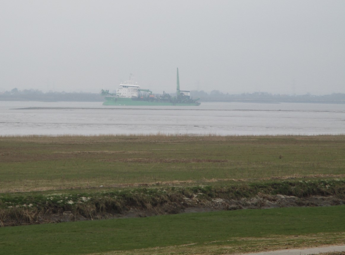 Dem fortwährenden Größenwahn entsprechend arbeitet nebendran unermüdlich der Saug-Klapp-Bagger Ulenspiegel (Schiffsinhalt geht Richtung Elbmündung, Nordsee).