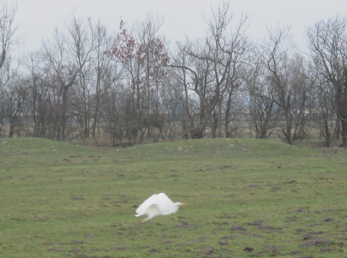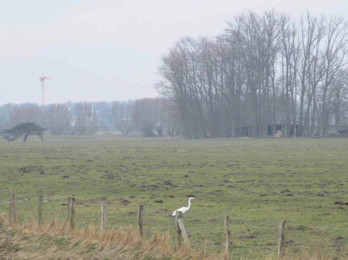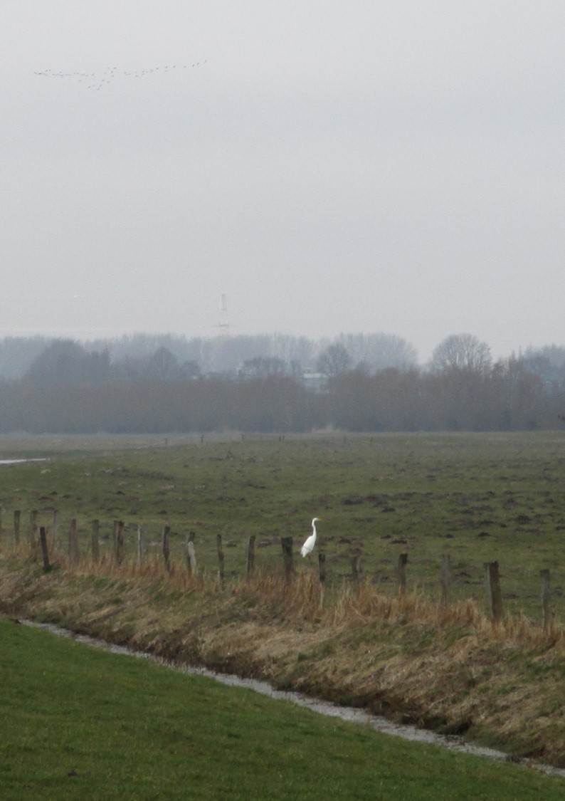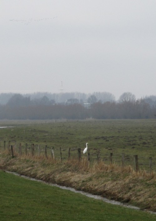 … steht da doch ein Silberreiher herum, dem niemand seine Fluchtdistanz mitgeteilt hat. (Oben links zu ahnen: ein Gänseschwarm.)