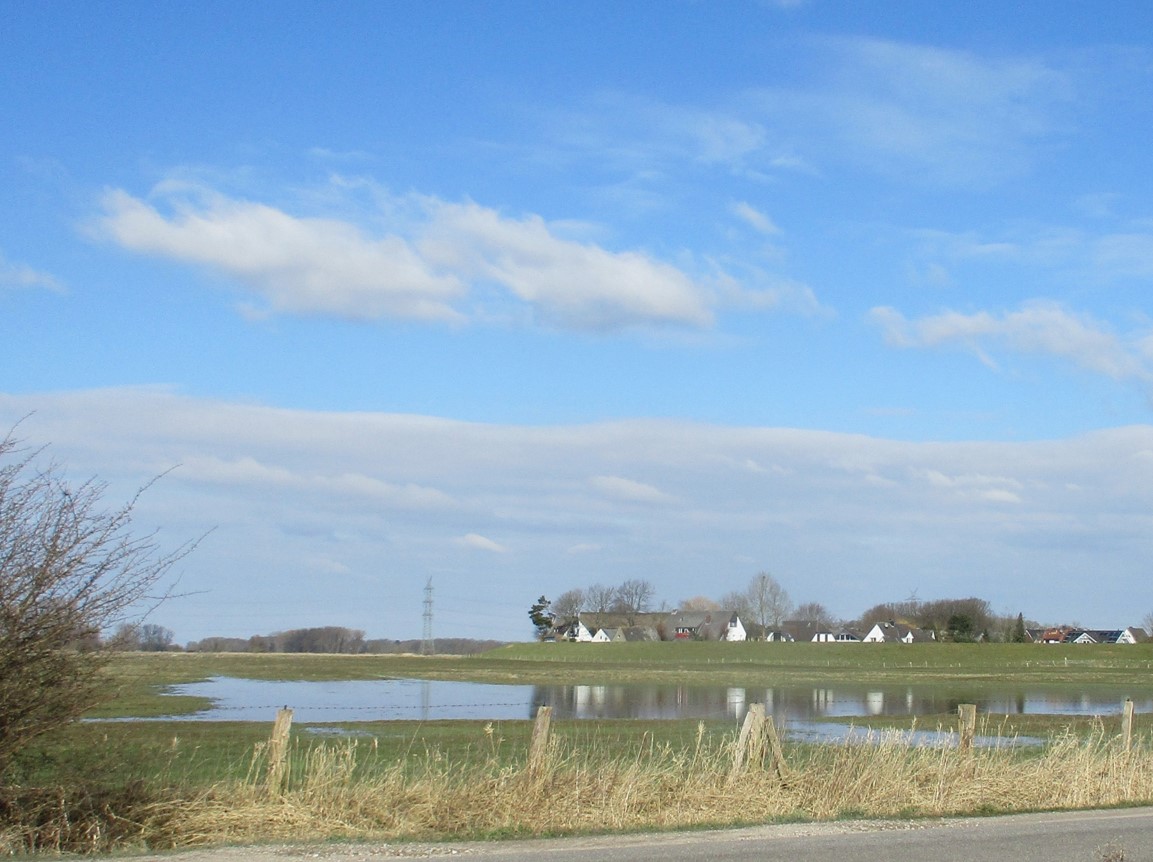 Gegenüber spiegeln sich noch alter Deich und Häuser Hetlingens im Wiesen“see“. Zum Schlittschuhlaufen hat dessen Eisdicke diesen Winter nicht gereicht.