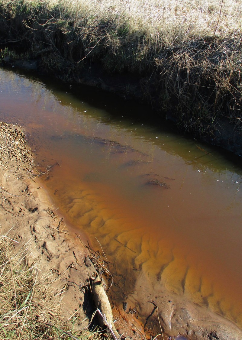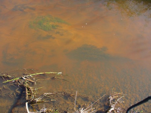 Dieses Foto zeigt eine flottierende Wasserpflanzenart über stark entwickelter Tiefenvarianz – im vorderen Bereich Ocker durch Eiseneintritt, ruhender und bewegter Sand („Rippelmarken“).