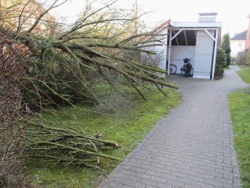 Dank Halt durch die Rose fiel der Baum optimal – zwischen zwei unserer Tiefgaragenlüfter mit Fahrradhäuschen, diagonal.