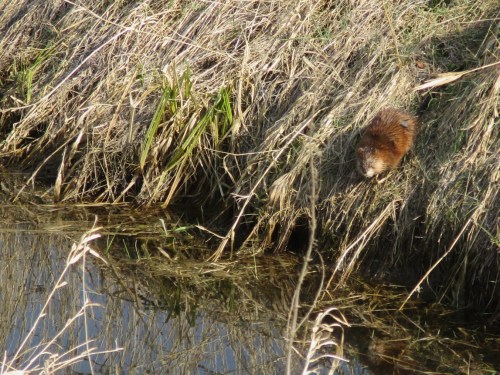 Ein Bisam sonnt sich, beäugt mich argwöhnisch (erstaunlich, dass der überhaupt noch da sitzt!) – und springt ins Wasser, taucht, … und weg.
