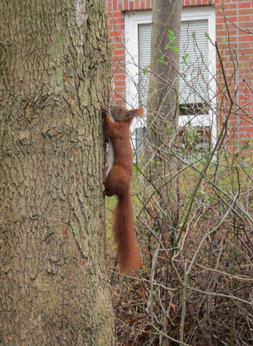 So putzig vom Frühstückstisch aus die Kletter- und Sprungübungen über die Busch- und Baumfassade unseres Grundstücks aussehen und alle Betrachter erfreuen, Eichhörnchen (und hier, fütterungsbedingt: zu viele) als Bruträuber und Stöberer in allen Buschhorizonten verhindern oder vernichten allzu viele Vogelbruten. Ob das diesjährige Auftreten von Hörnchen mit bis zu großflächigen Lücken im Fell – wohl Räude -, an deren Vielzahl liegt, mag dahingestellt bleiben. – Der Nachbar ist auch Vogelfreund, vielleicht reduziert er seine Nussgaben jetzt.