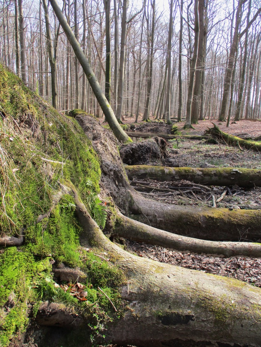 Buchen reagieren auf die zunehmende Feuchtigkeit – hier frische, auch bereits länger liegende (s. waagerecht gewachsene Baumpilze) Sturzbuchen.