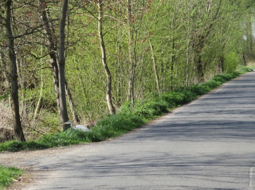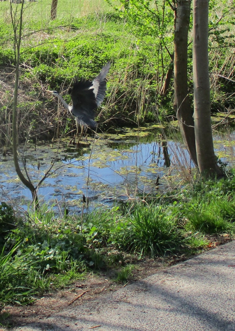 Dabei blieb es allerdings nicht, da vom Deich her ein Ungetüm von Trecker mit Muldenkipper voller Treibsel bis hin zu dicken Baumstämmen röhrend und rumpelnd nahte. Das war dem Reiher dann doch zuviel (mir fast auch, nahezu kein Straßenraum blieb für den schwächeren Verkehrsteilnehmer). Der Reiher flog protestierend Richtung Marschwiesen ab.