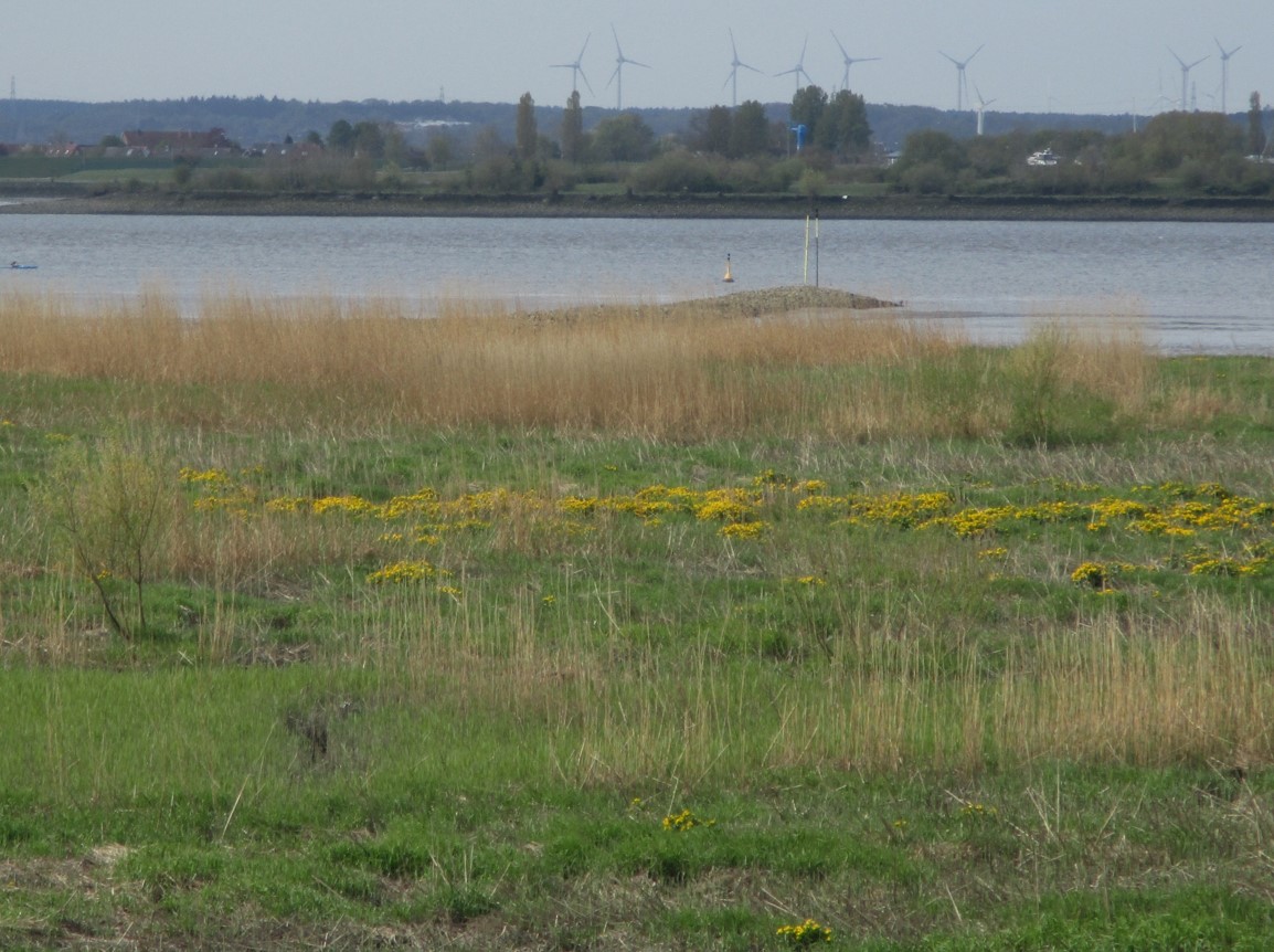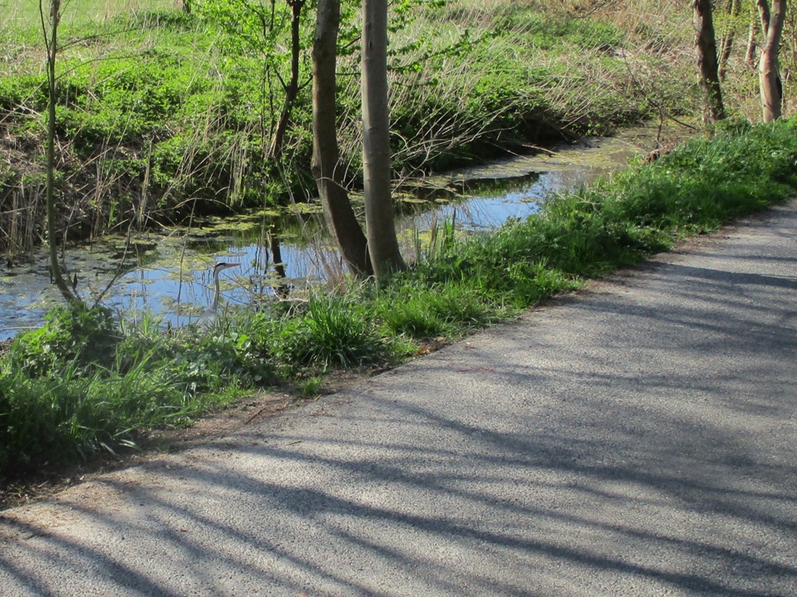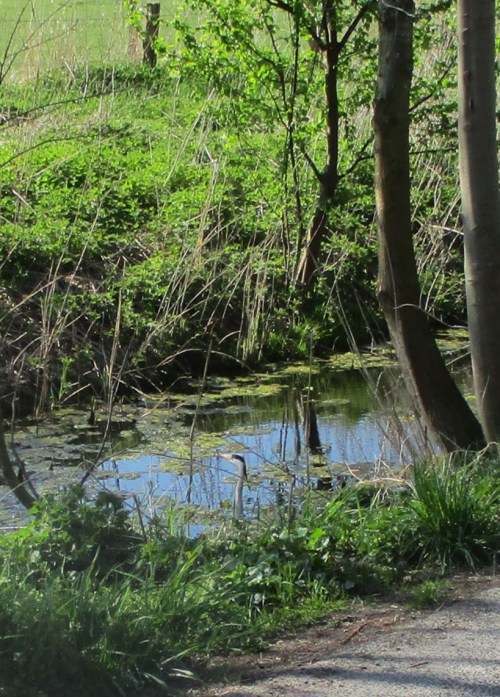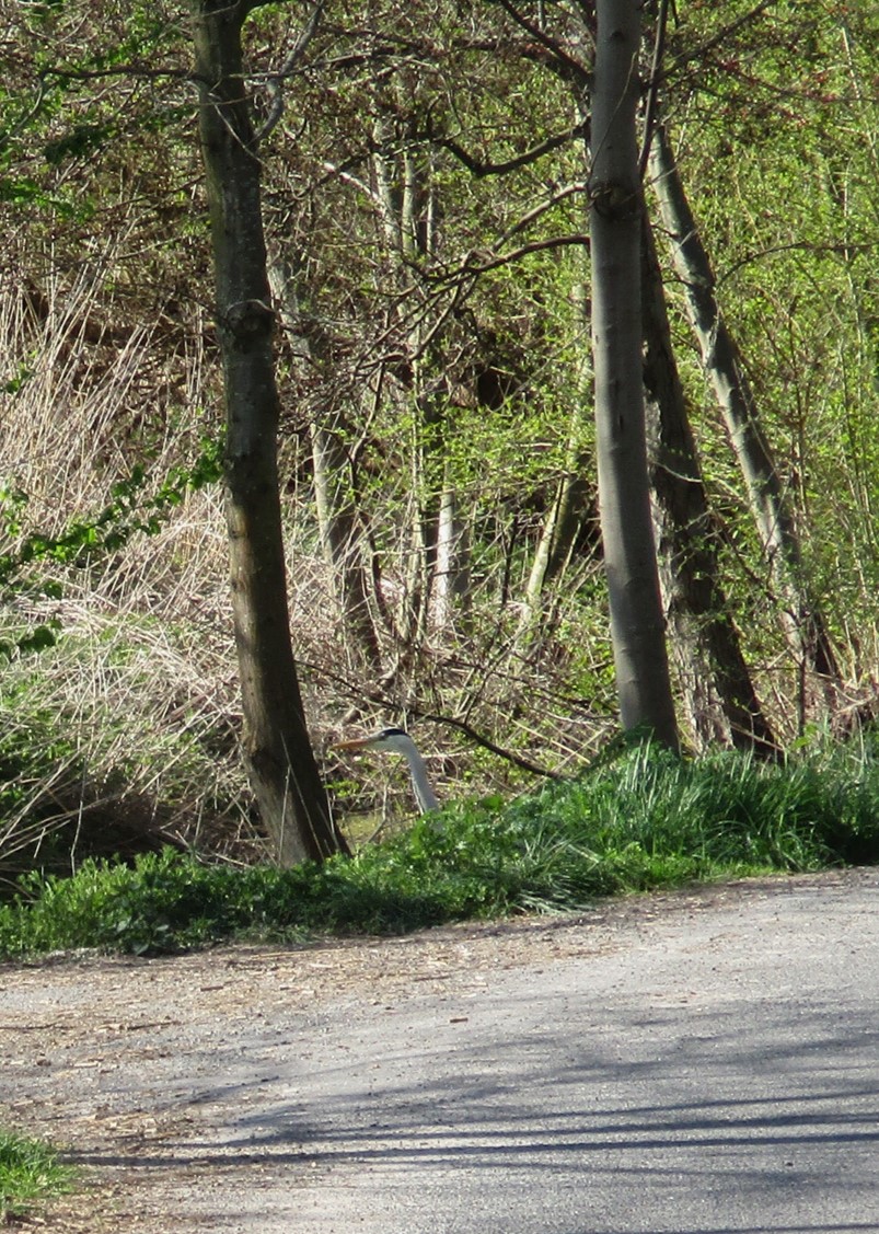 Begegnung querab Hetlinger Heuhafen – der Graureiher meint, sich ungesehen verdrücken zu können.