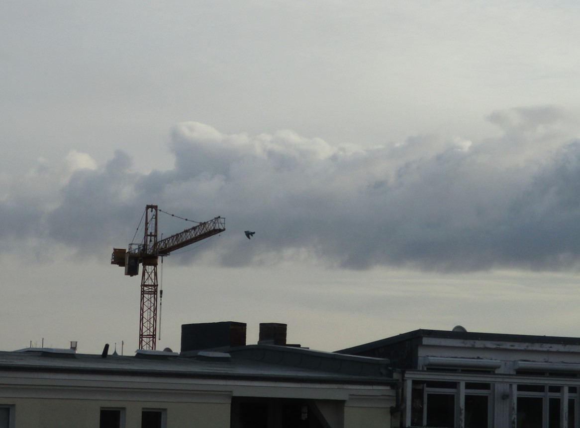 Der Morgen schreitet voran – illuster in Grau, mit Nebelkrähe vor Kran.