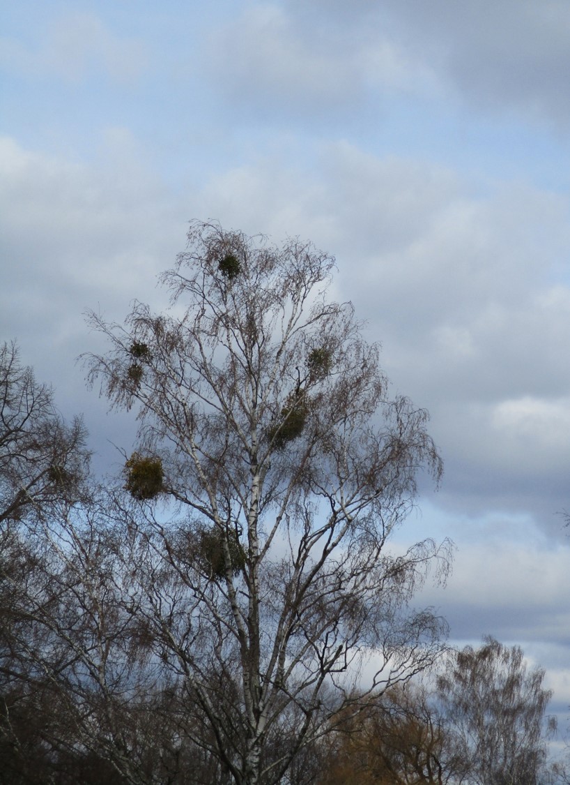 Dort pfeift ein eisiger Wind – Birke mit Misteln wird ordentlich geschüttelt.