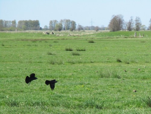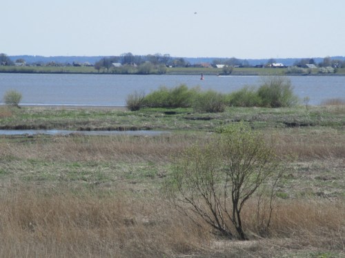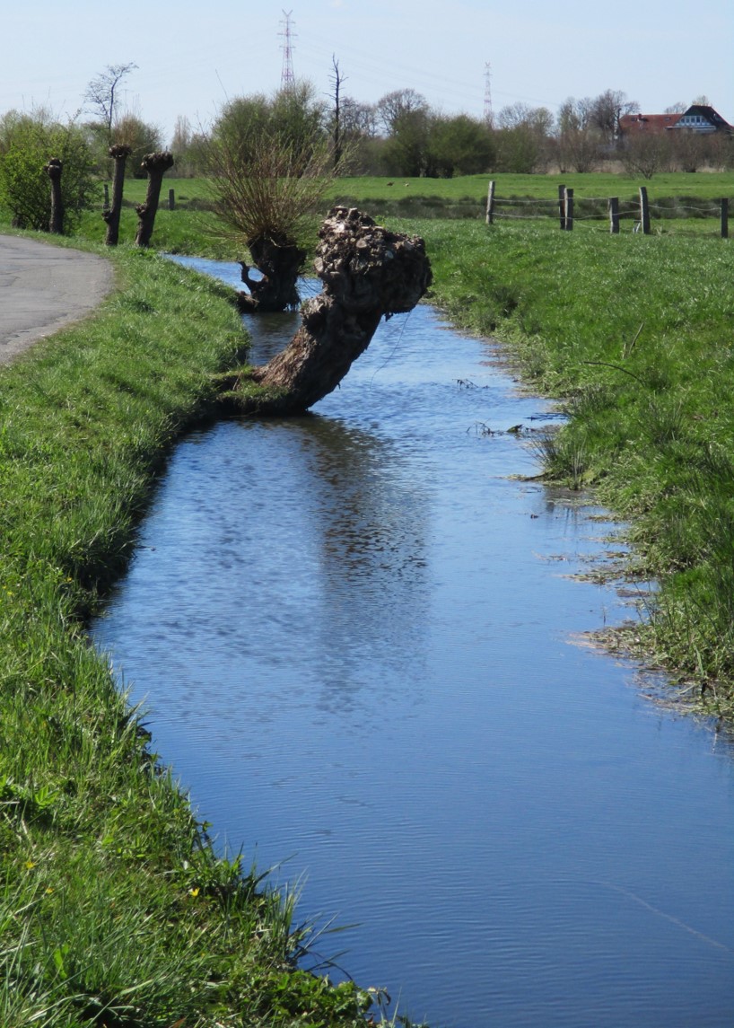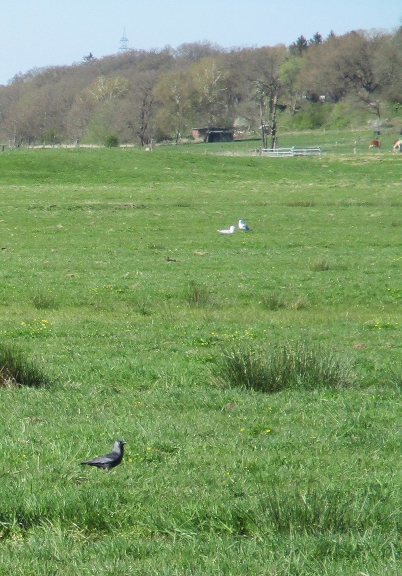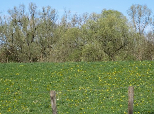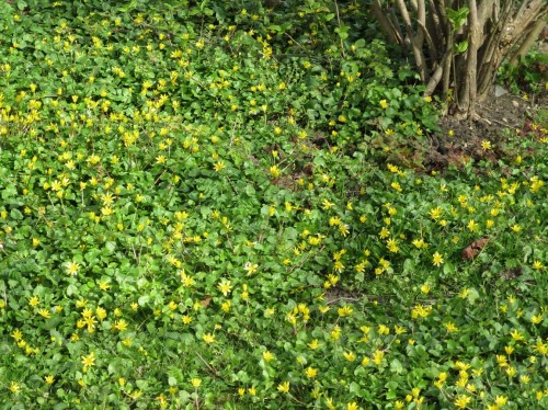 Anderer Ort, anderer Deich – in Wedel, Elbdeich nahe dem Hafen, ist das Scharbockskraut-Gelb dem des Löwenzahns gewichen.