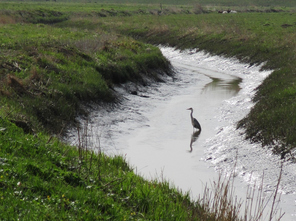 Querab vom Hetlinger Heuhafen steht ein aufmerksamer Graureiher im leergelaufenen Marschgraben, Tnw.