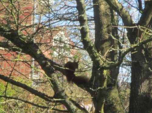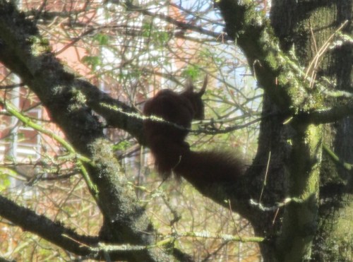 Bei uns herrscht bei sonnigem Wetter kühl unterlegter Ostwind – das Eichhörnchen hält sich im Windschatten auf. Offenbar ist es im Schatten angenehmer als im Zugigen.