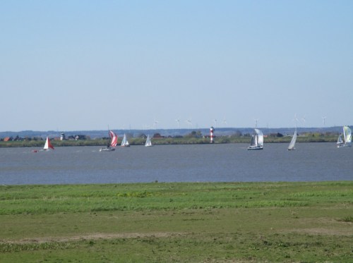 Das Wochenende nach Ostern hat hier wohl zur ersten Regatta geladen – die vordersten Segler sind vor der Lühemündung angekommen.
