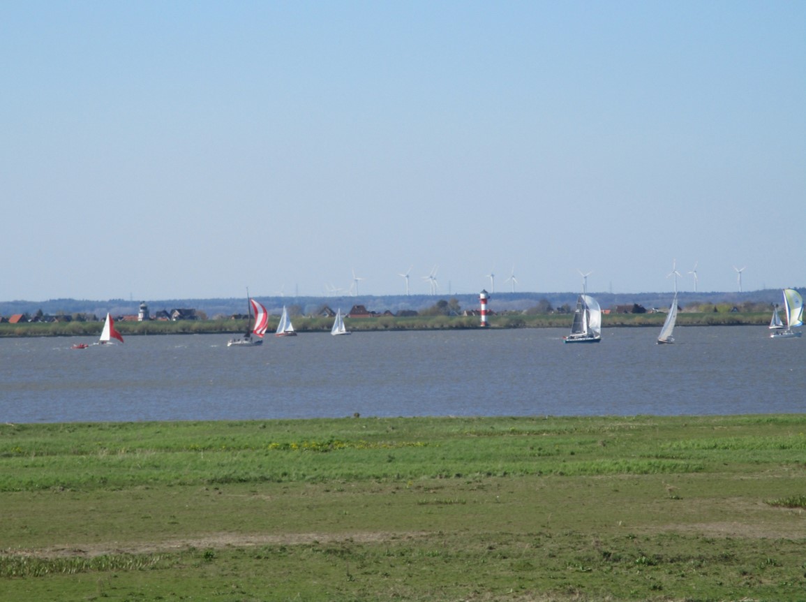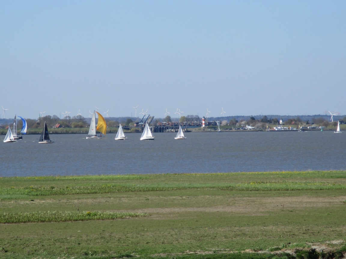 Das Wochenende nach Ostern hat hier wohl zur ersten Regatta geladen – die vordersten Segler sind vor der Lühemündung angekommen.