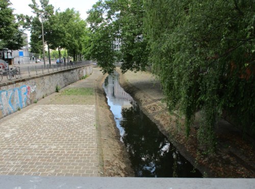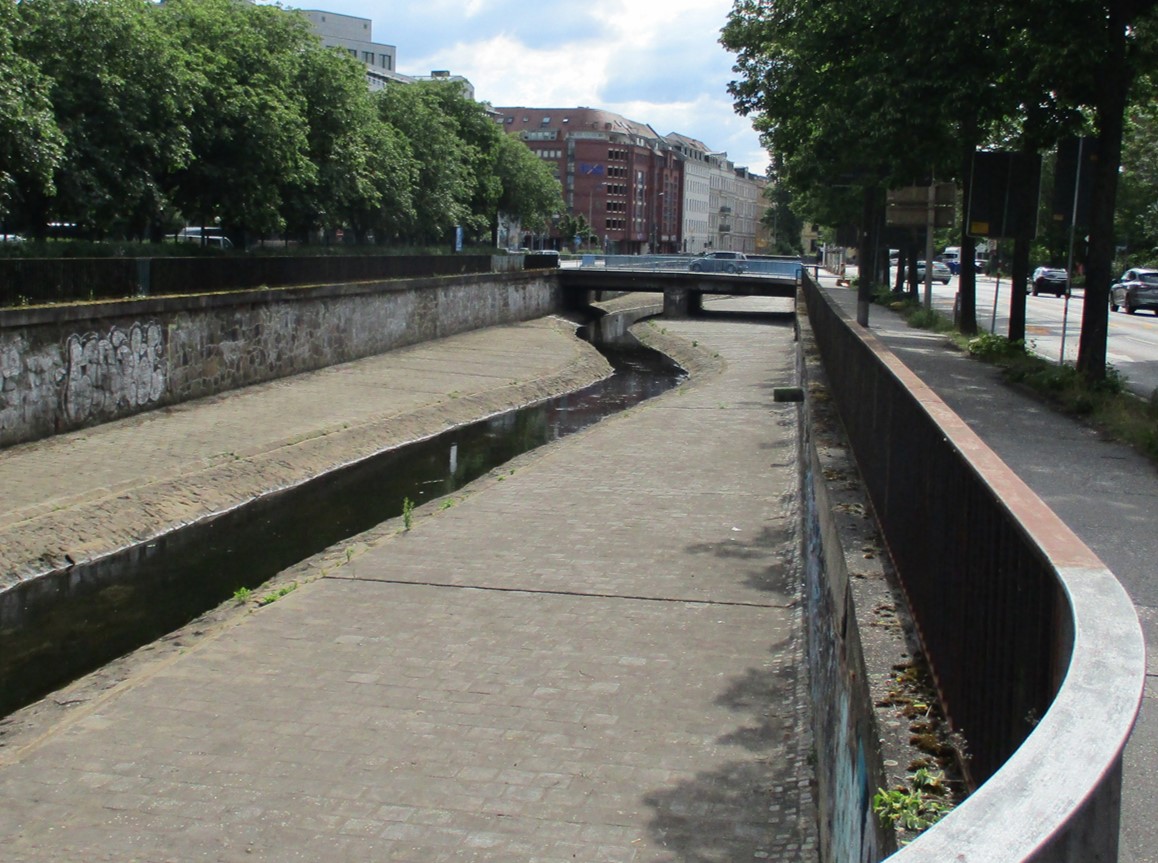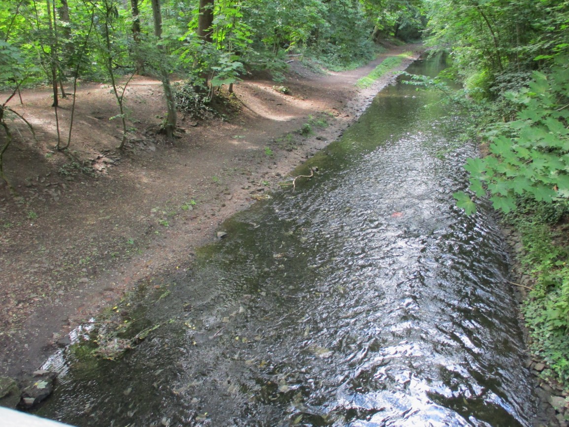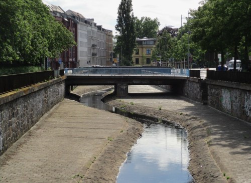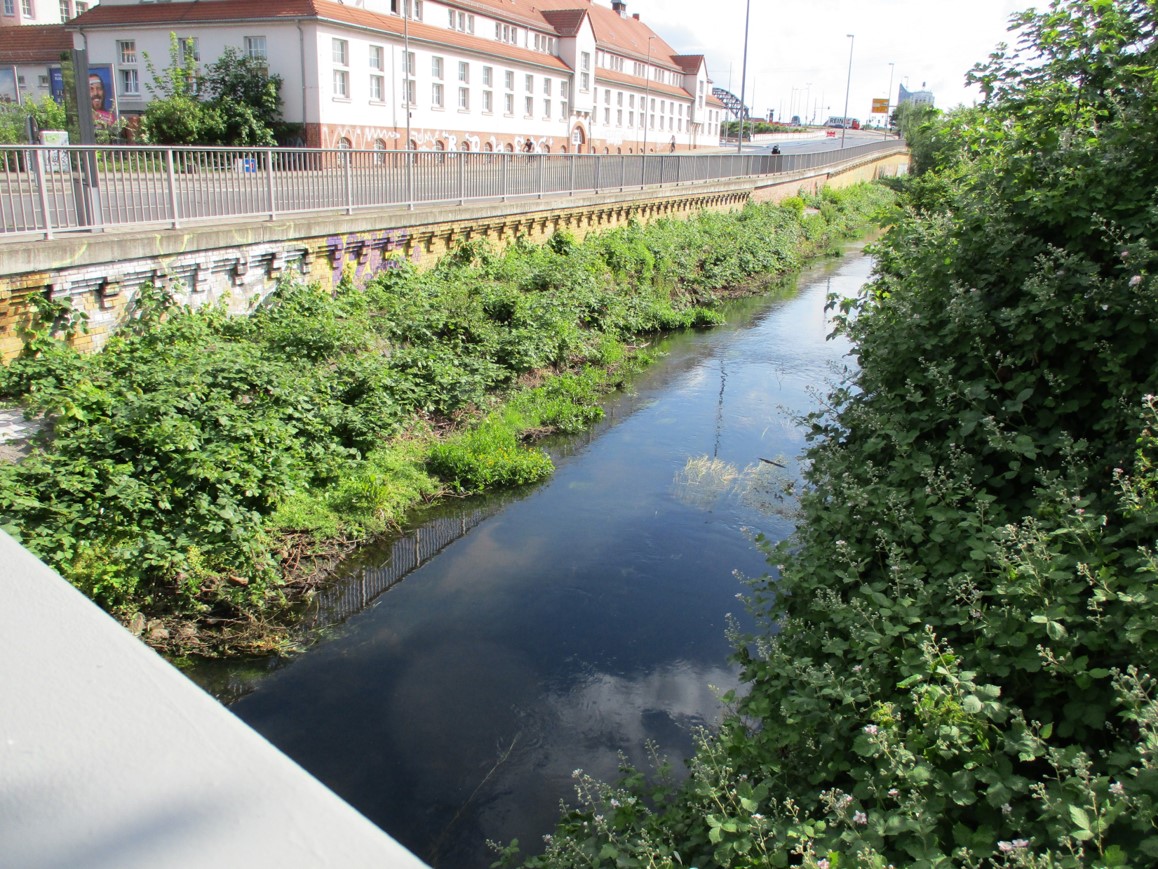 Blick von der Brücke, bachauf – das also ist die im Volksmund so trefflich bezeichnete „Beton-Parthe“, tief fliesst sie zwischen Niedrig- und Mittelwasser im Trapezprofil.