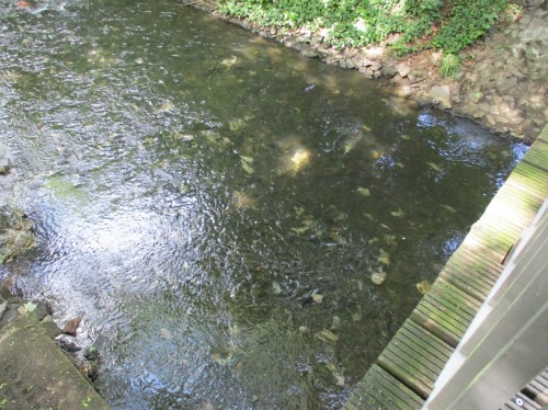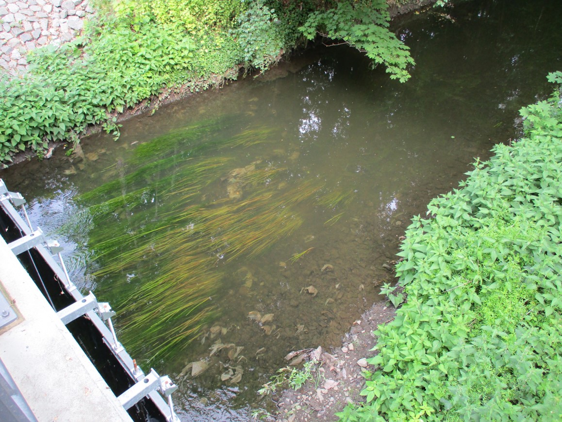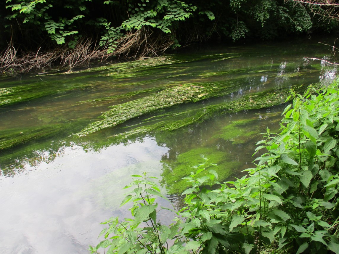 Oha, es hat länger nicht geregnet, aktuelle Mischwasserüberläufe schliessen wir also erstmal aus. Hat ein Fehlanschluss diese auf dem Gewässergrund hängenden, flatternden Hinterlassenschaften verursacht? Die Wasserbehörde ist durch Anruf nun informiert.