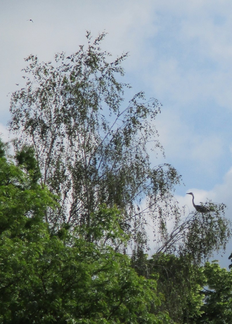 Es sind auch lebendige, frei fliegende Nachfahren der Saurier zu sehen. Oben links vermute ich einen Mauersegler und einen weiteren kleinen Singvogel. Rechts hat sich gerade ein Graureiher aufgebaumt.