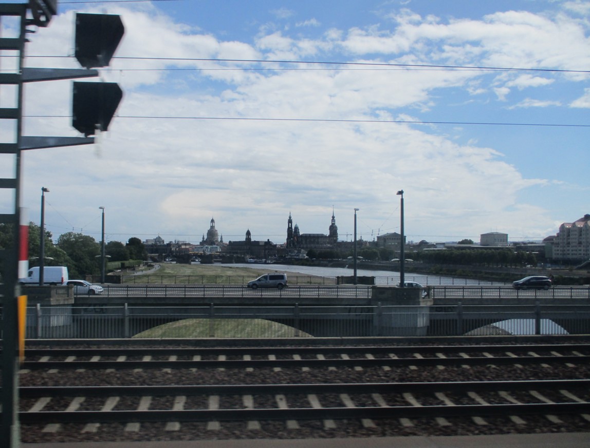Einfahrt per Bahn, von Berlin her. Was für ein Service: Die historische Totale – Terrassenufer im Aussenbogen der Elbe.