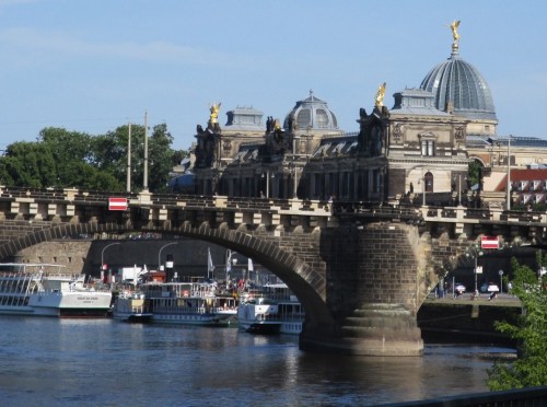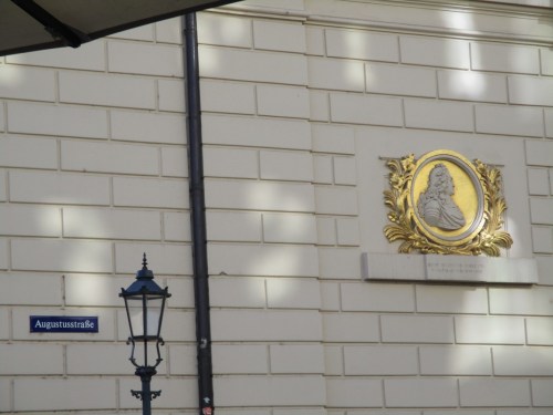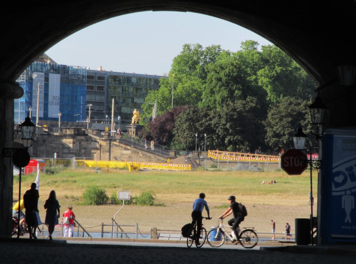 Spät erkennen wir bei historischem Brühl-Durchblick, dass der Goldene August, pardon: Reiter jenseits der Brücke bereits von Weitem erkennbar ist.