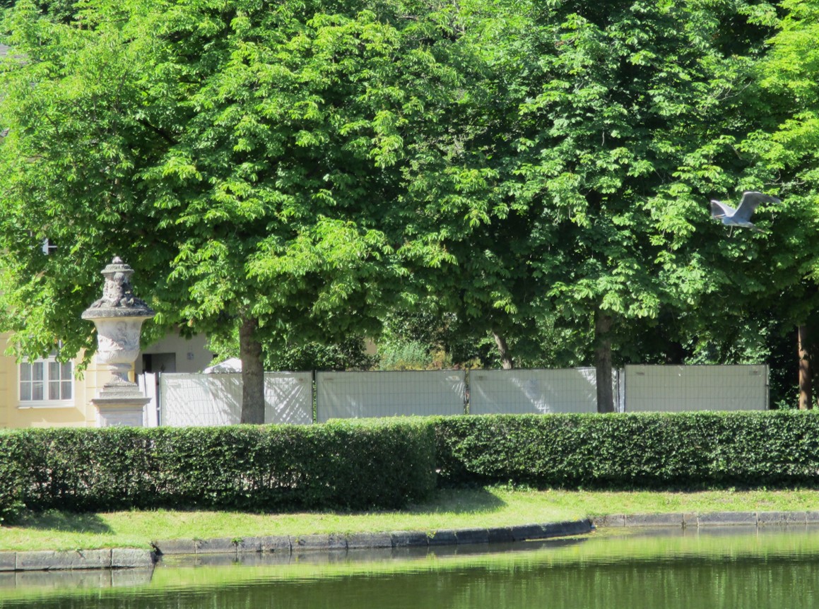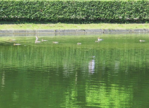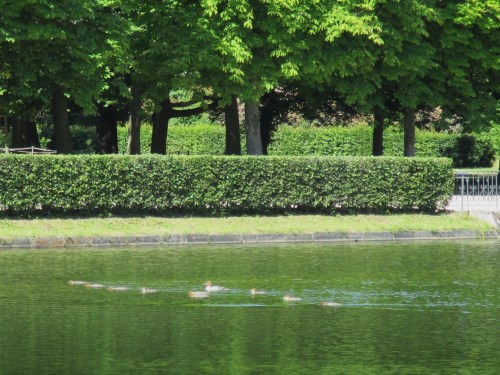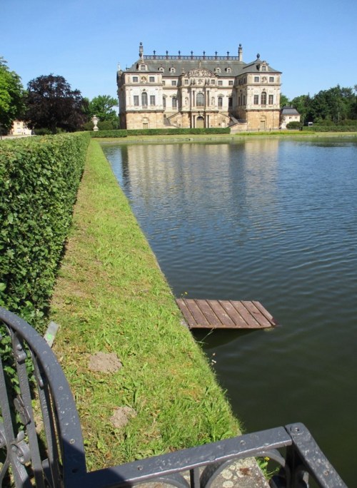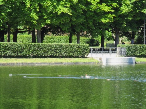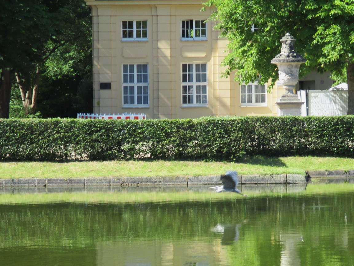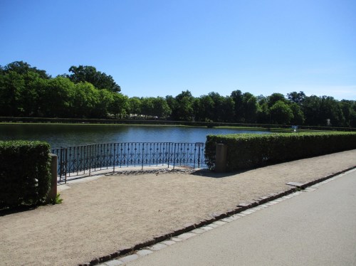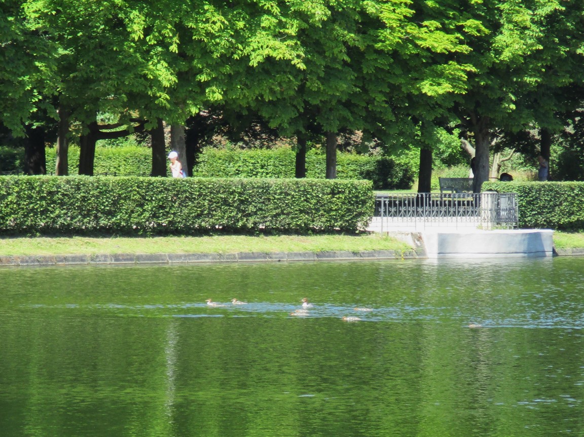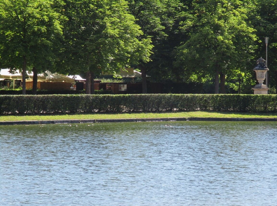 Der Palaisteich im Großen Garten, Blick West – angesichts senkrechter Ufer freundlich mit Ein- und Ausstieg ausgestattet.