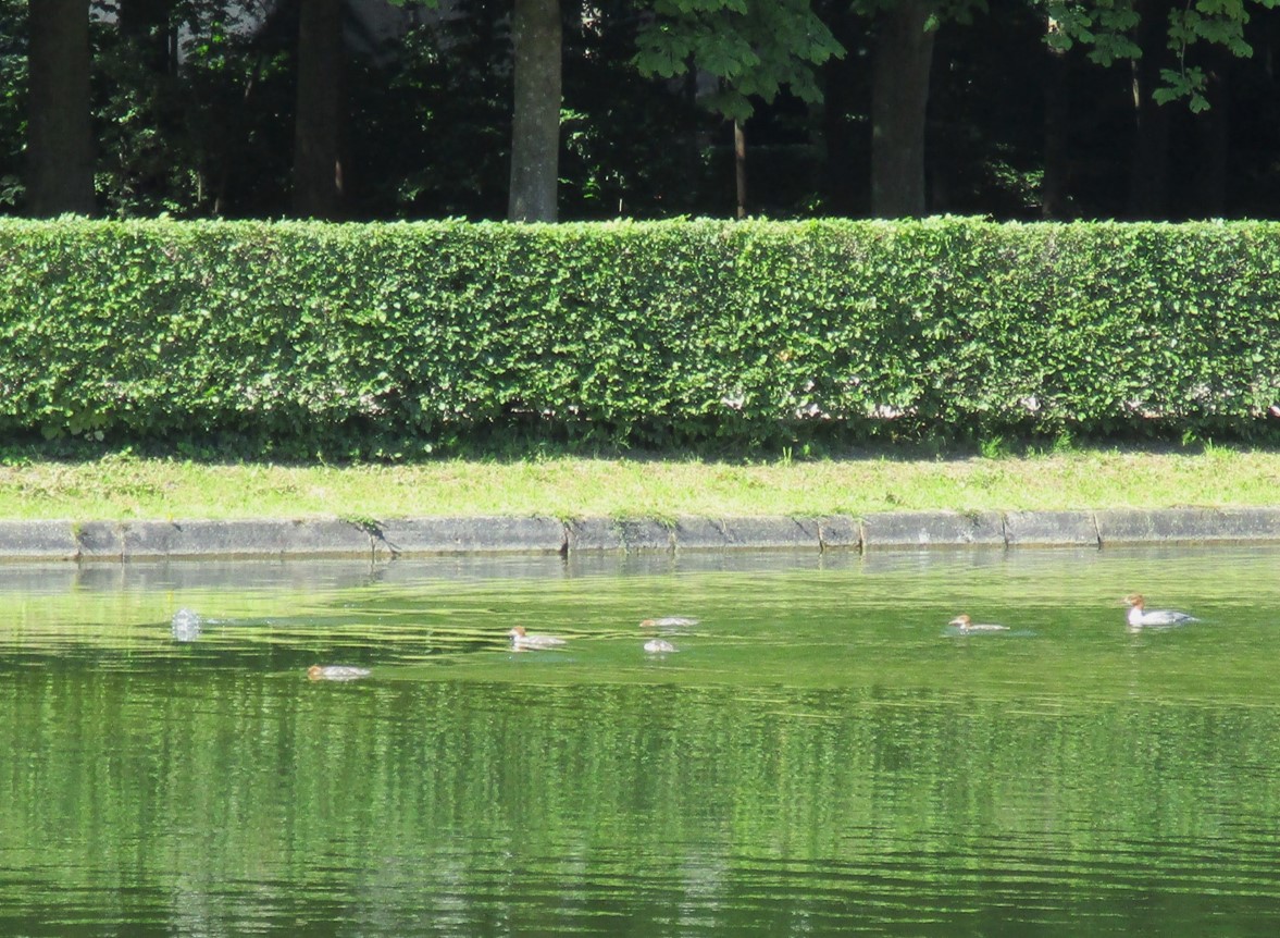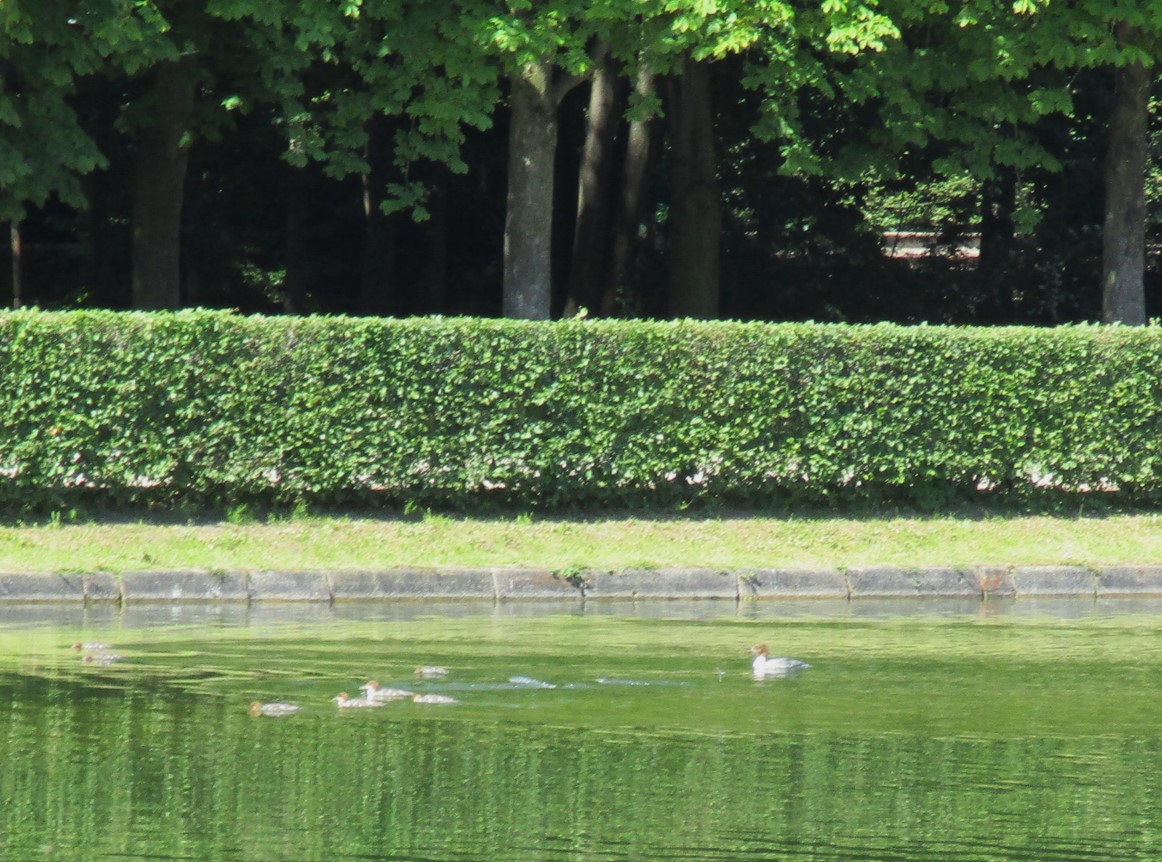Jaaaa, das Nichtfüttern von Wasservögeln verhindert Entenmassenansammlungen mit all ihren Nachteilen – hier schwimmt wer anders. (Mittel?)Säger im Geschwader, zahlreiche Nachkommen.