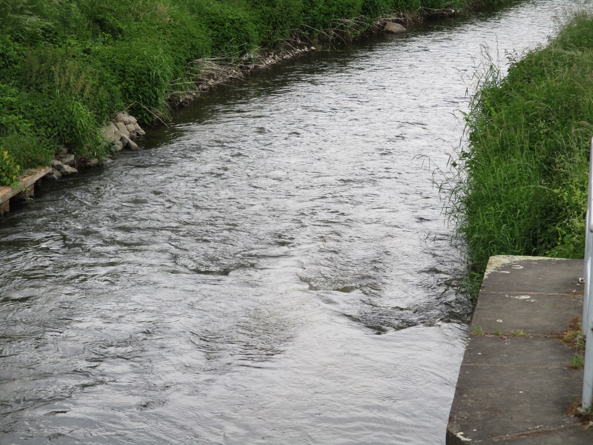 Blick von der Brücke, bachauf – das also ist die im Volksmund so trefflich bezeichnete „Beton-Parthe“, tief fliesst sie zwischen Niedrig- und Mittelwasser im Trapezprofil.