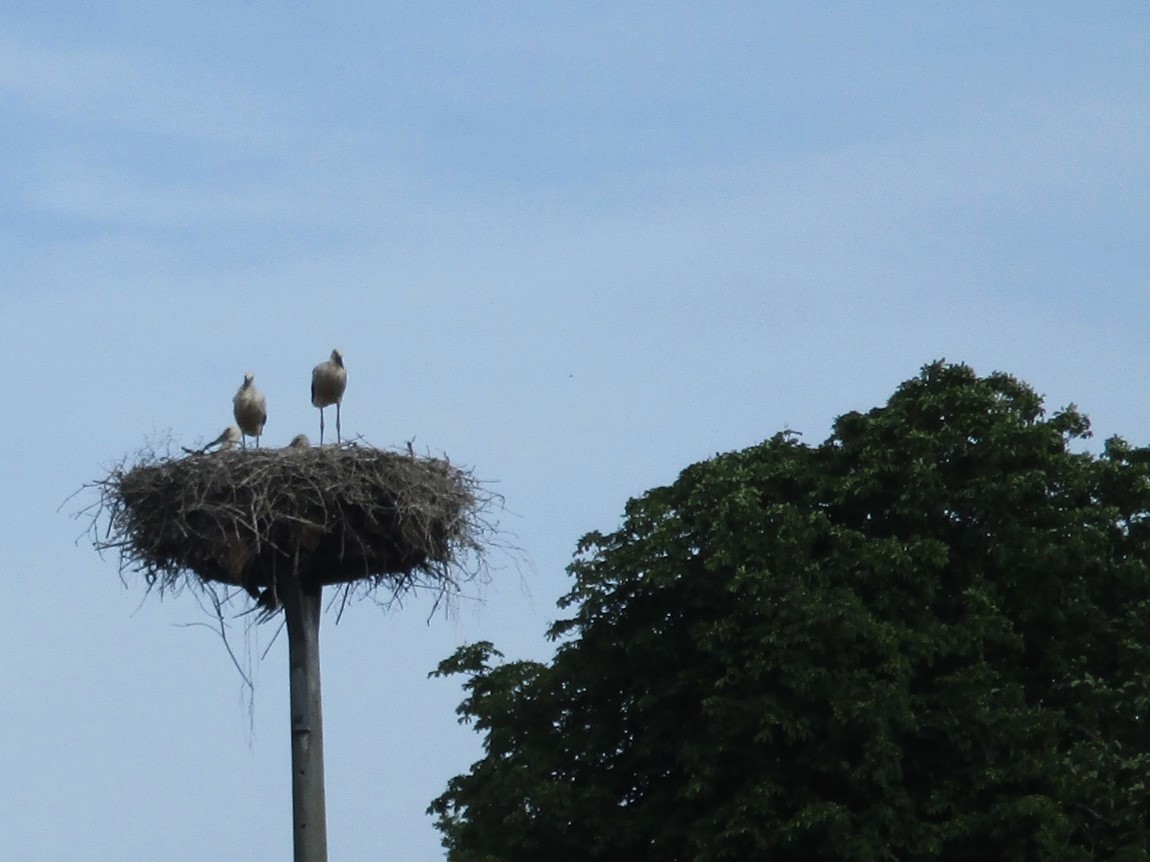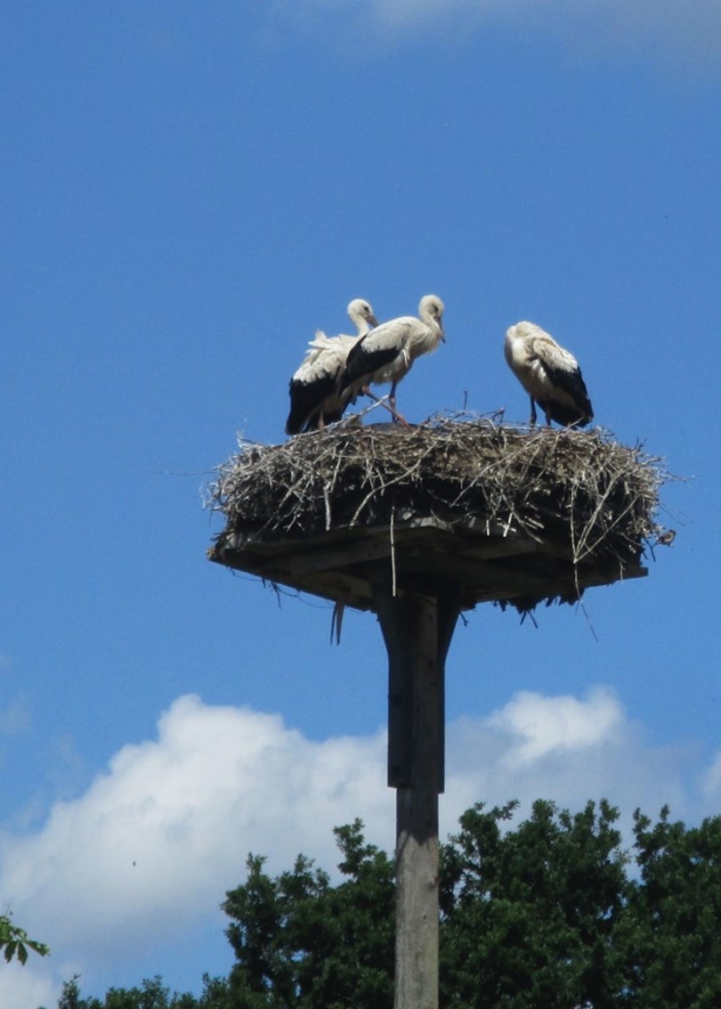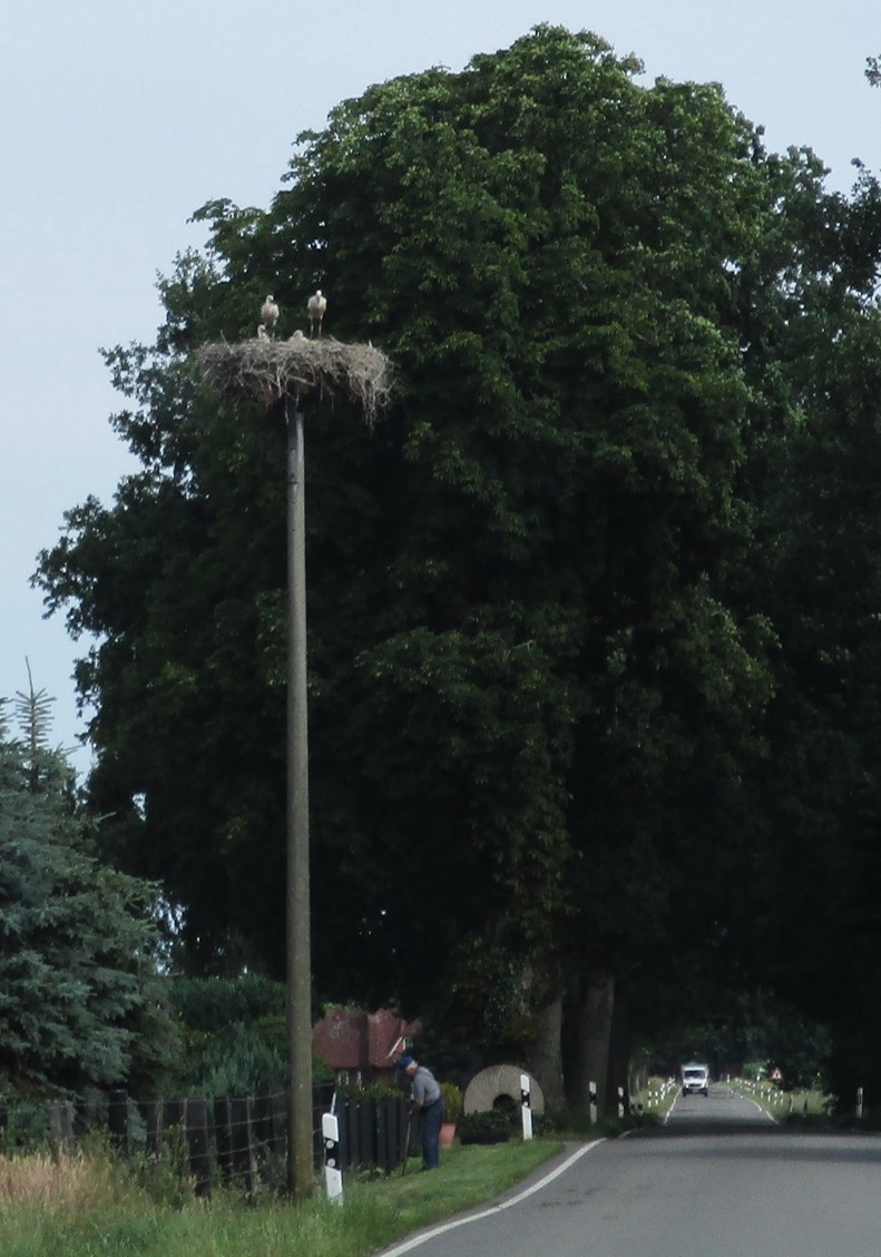 Bei zwei Fahrten, An- und Abfahrten zu aktuellen Restaurierungen, sah ich kürzlich Storchennester – mit Jungen.