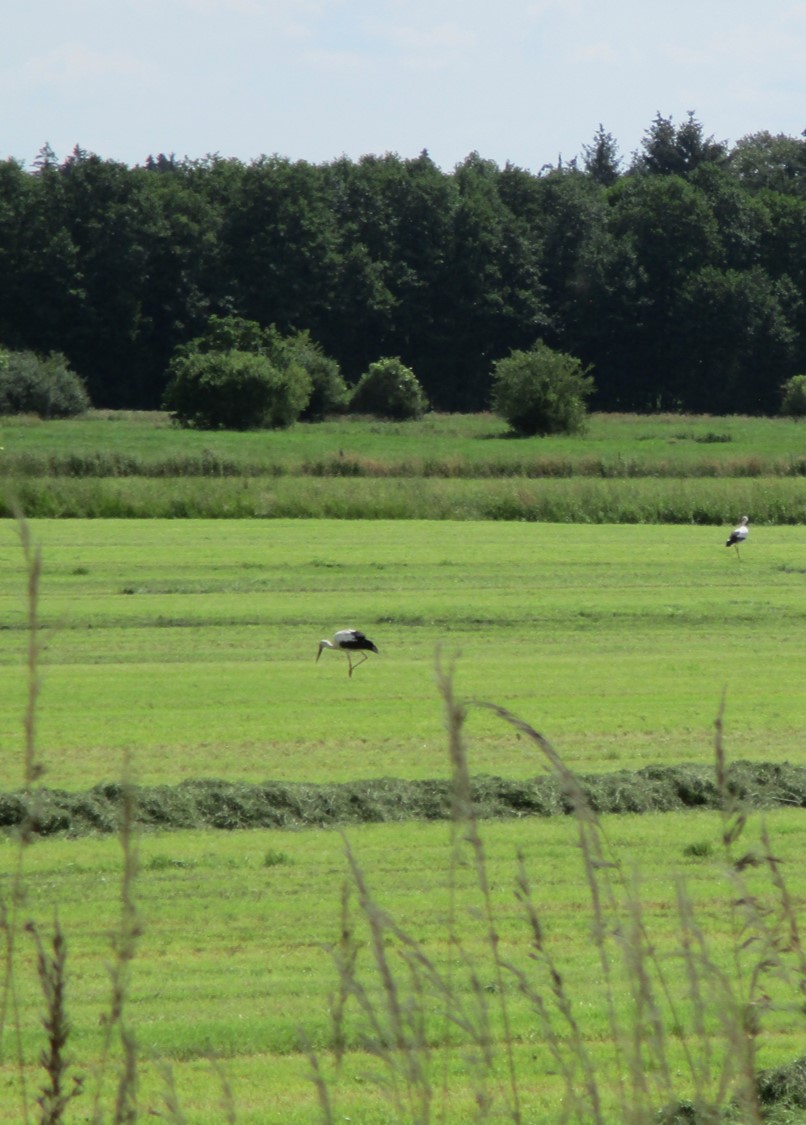 Die war gemäht, das Gras angetrocknet, geschwadet. Der Silo-Ernter wartet auf die zugehörigen Transportgefährte. Klein sichtbar 2 von 3 Altstörchen, Futter suchend.