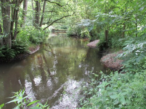 Fliesst hier eigentlich viel oder wenig Wasser? Die naturnahen Mäanderbögen und die dazwischen liegenden Geraden sowie die Ufer geben Hinweise. Der Pegel Bad Bramstedt, weiter bachab, berichtet die statistischen Daten: Wasserführung mittel bei knapp 2 m³/s, niedrig bei weniger als 1 m³/s (das ist gerade die aktuelle Situation), hoch bei 7 m³/s – wie bei jeder Statistik geht es noch niedriger bzw. noch höher. Das vergessen wir Menschen oft (Ahrtal) – besser gesagt: wir verdrängen das, sogar aktuell nach der „Katastrophe“. Am liebsten wollen wir alles wieder aufbauen, genau so und genau am selben Standort. Wasserbehörden und Klimafachleute haben einen harten Stand zu vermitteln, dass unsere menschengemachten Probleme an Gewässern nur dadurch zu mindern sind, dass wir diese Engstellen NICHT wiederherstellen, den Flüssen mehr Raum bieten.