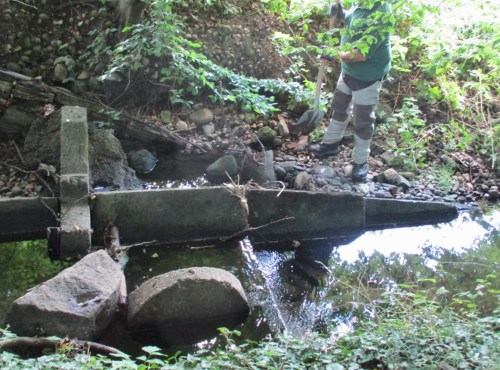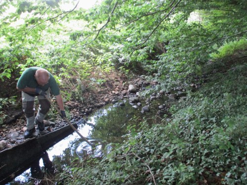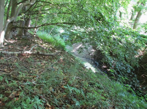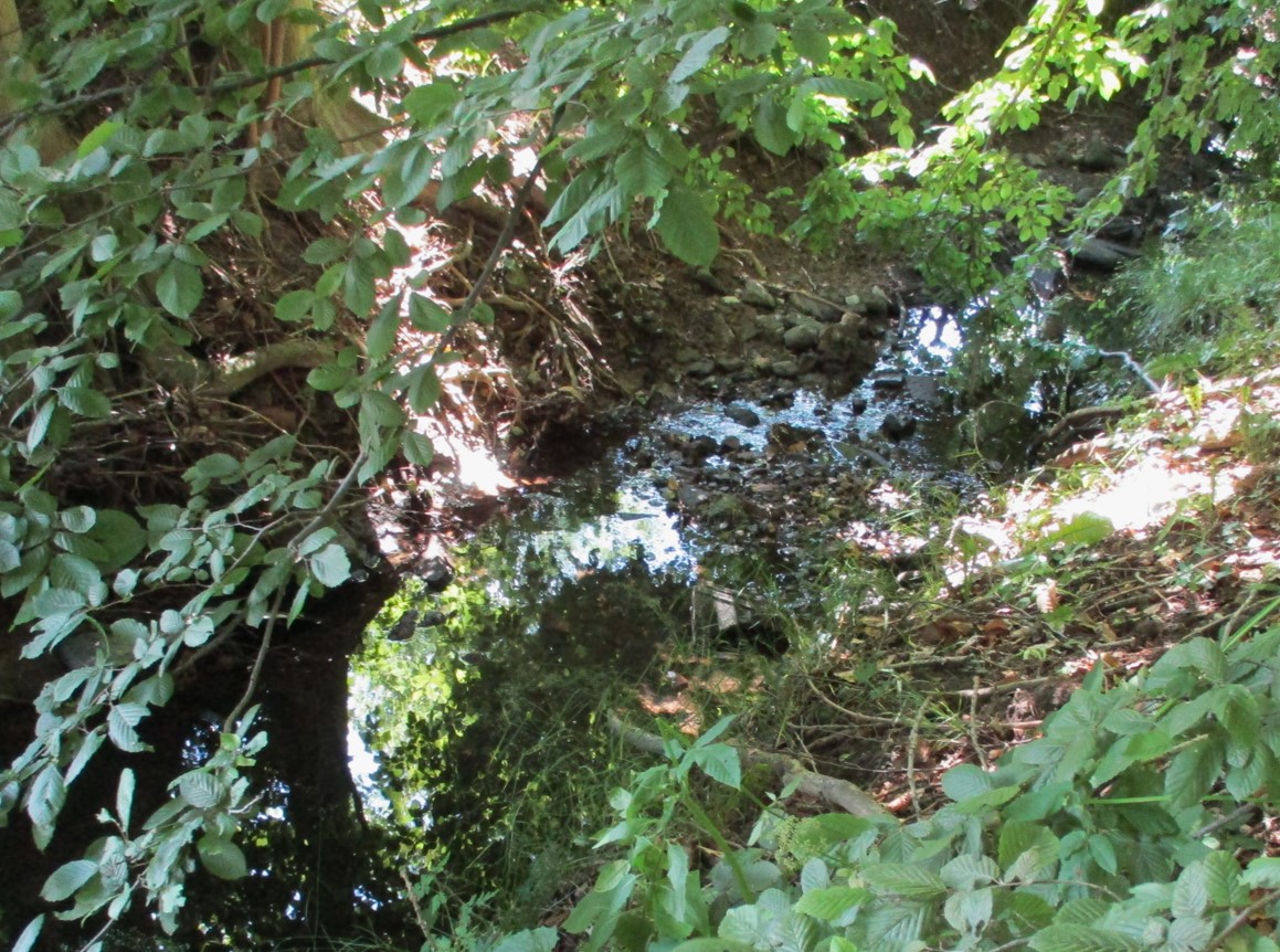 Wir sind für Verbesserungen verabredet, finden den sommertrockenen Bach tief eingeschnitten neben einem Hain. Nach einem – seltenen – Regenschauer ist die Sohle leicht feucht.