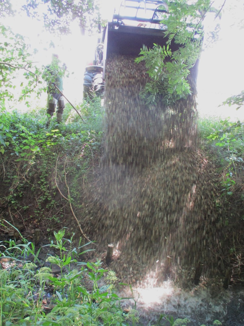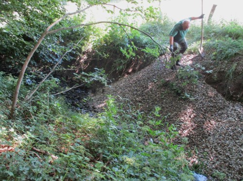Für den Hochwasserfall legen wir ein Kiesdepot in den Prallhang. So hat der Bach etwas „zum Spielen“.