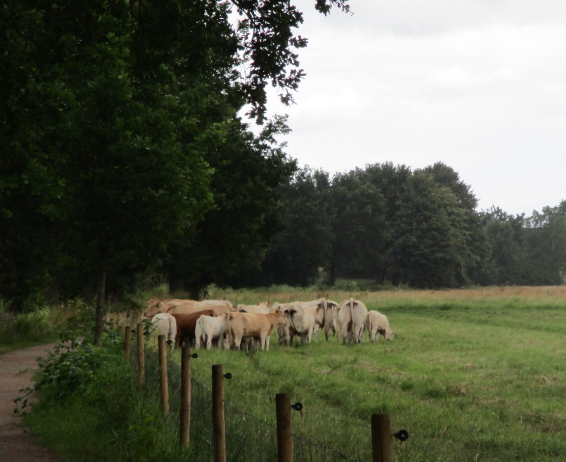 Selten gesehen, bei Regen gern freistehend – Rinderherde, bei Sturm und Schauern, versammelt im Windschatten.