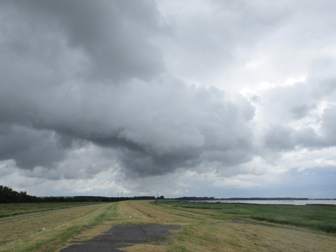 Auf Höhe NABU Vogelstation treffe ich ein Radlerpaar, dass andersrum tourt – voll durchs Wetter, gegenan, durchgefahren. Sie ziehen die Regenklamotten aus. Letztlich ist es drunter auf Dauer fast unangenehmer, als ohne zu fahren (na ja …).