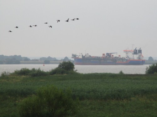 Elbdeich Hetlingen – schlimmer Vogel auf der Elbe, Saugbagger Utrecht, bekannt. – Eine Gruppe Graugänse zieht über das Deichvorland.