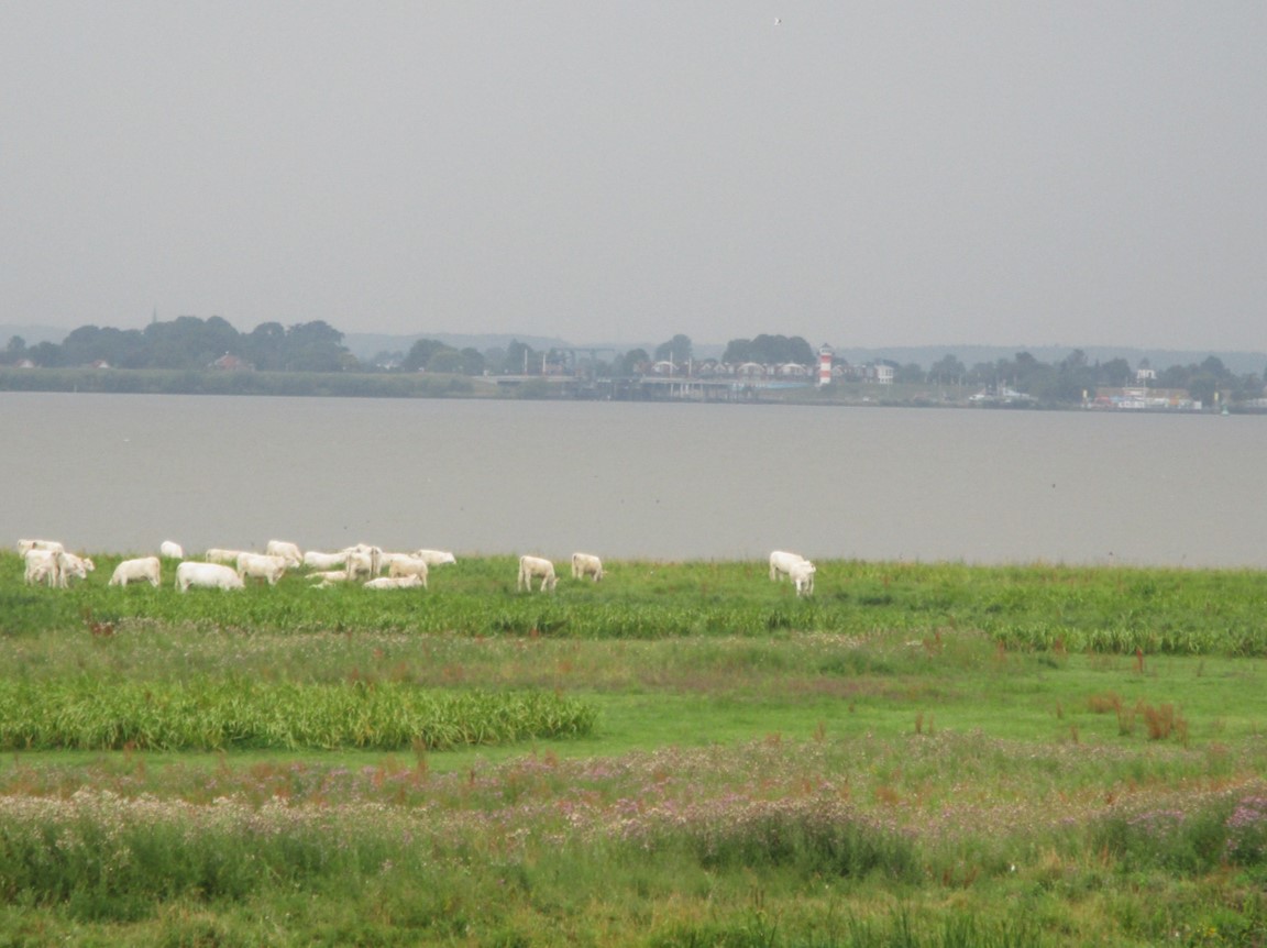 Fährmannssand – Rinderherde an der Wasserkante. Gegenüber die Lühemündung, der Anleger – weit und breit keine Lühe-Schulau-Fähre.