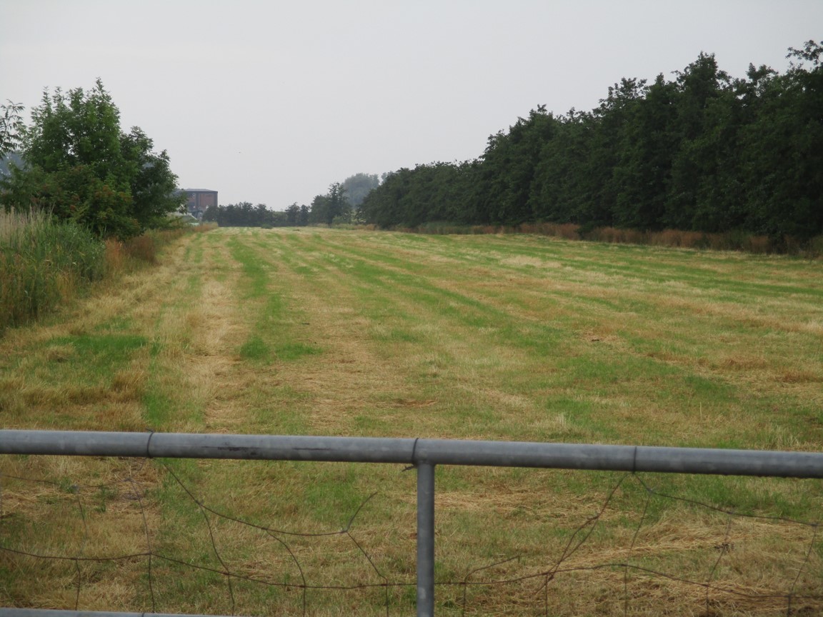 Die von Heuballen befreite Marschwiese Saatlandsdamm, querab des Sturmflutsperrwerks Wedeler Au – Einstau und Regen lassen das Gras sprießen.