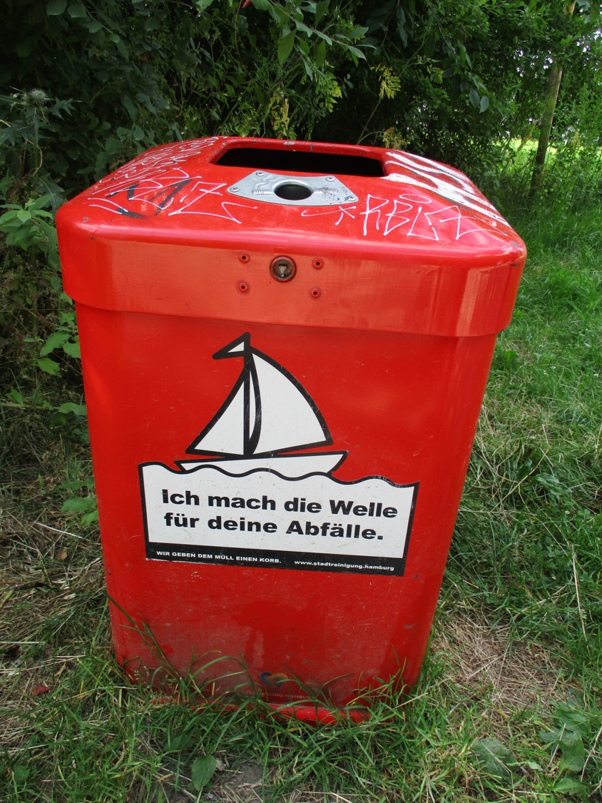 So ein prima Strand soll so verlassen werden, wie man ihn vorfinden möchte. Eine Vielzahl nicht übersehbarer Müllbehälter stehen als Angebot bereit. (Man könnte selbstverständlich den Kram, den man angeschleppt hat, wieder mitnehmen.)