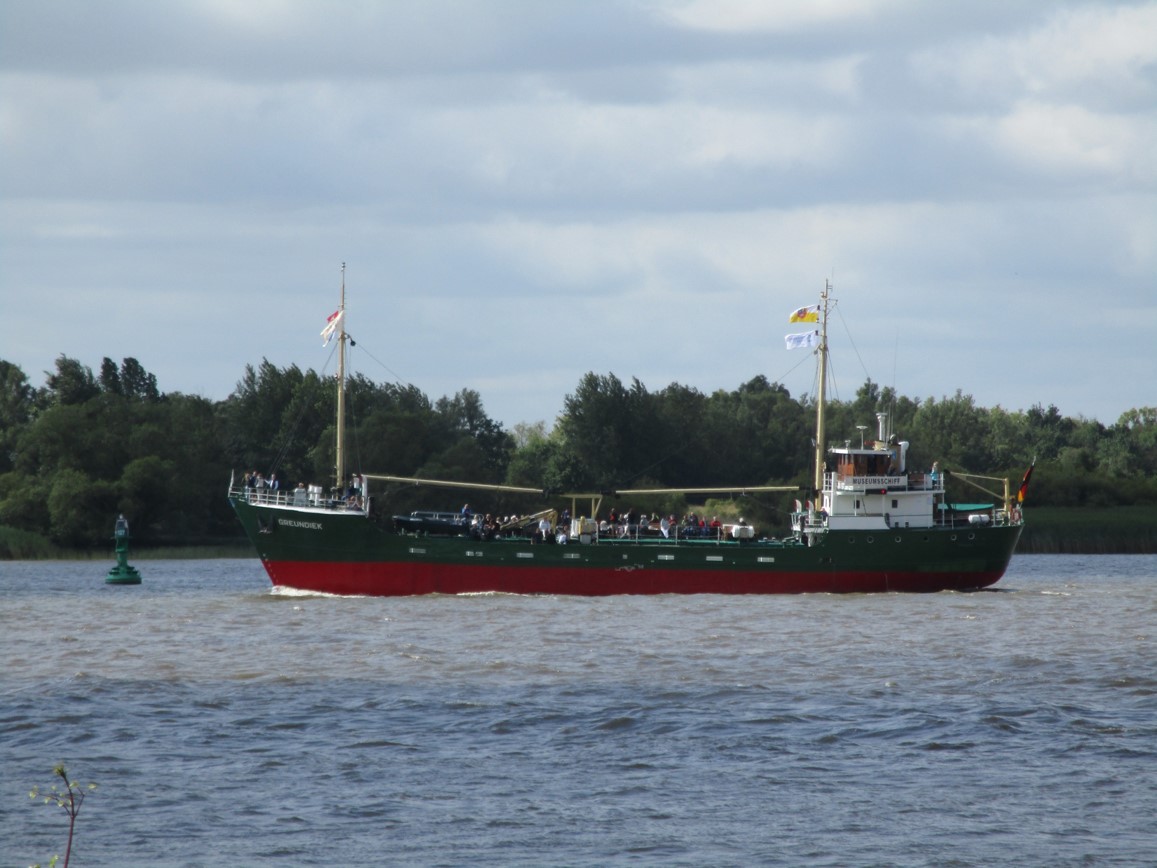 Neulich war auch das Museumsschiff Greundiek auf Rückkehr vom Ausflug nach Stade zu sehen. Gut besetzt und guter Laune – die Fahrt war offensichtlich ein tolles Erlebnis.