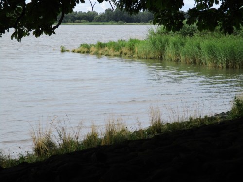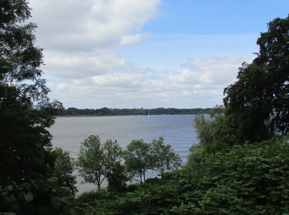 Blick über die Elbe zur Insel – das Fahrwasser mit Seeschifftiefe ist nach der jüngsten Verbreiterung (und Vertiefung) verdammt weit Richtung Moränenkante vorgerückt …