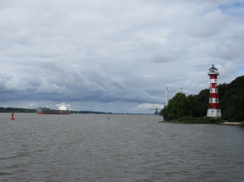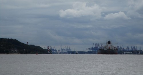 Elbhang, Leuchtfeuer Blankenese, Hafenkräne, ganz schön dick, so ein Massengutfrachter, Hafenkräne, rechts aussen die beiden Pylone der Köhlbrandbrücke.