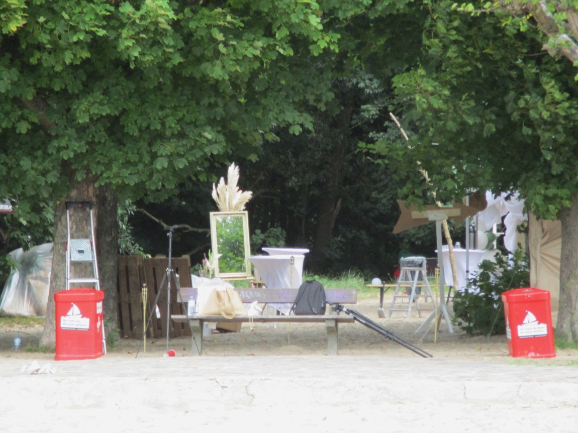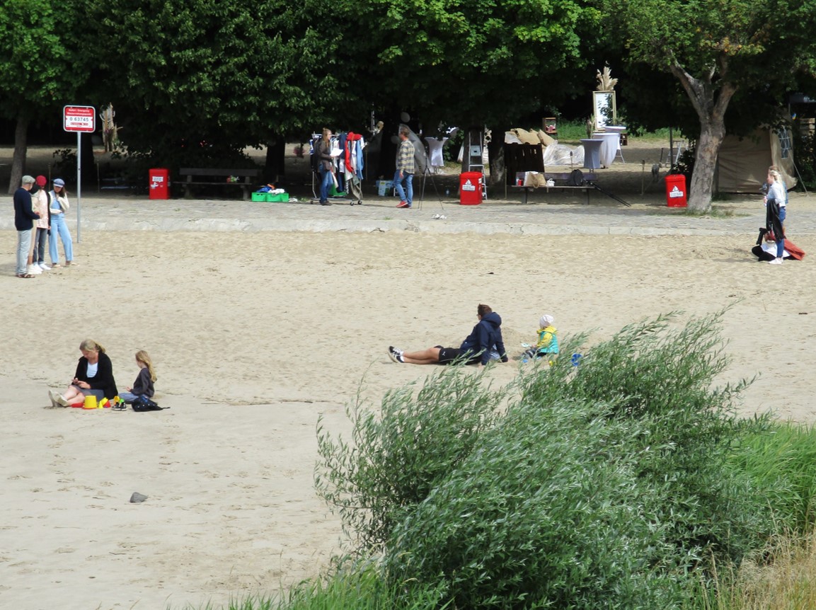 Sitzen am Spülsaum der vorigen Flut, unter Uferbäumen ist ein FotoDorf aufgebaut – wohl für Modeaufnahmen. Geduldig folgen die zu Fotografierenden den Anweisungen der Regie.