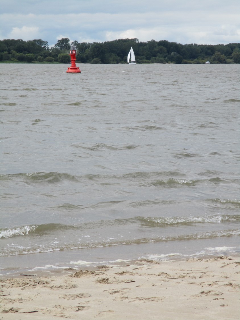 Der Strand – wo sind die Hamburger (und andere Besucher) ?!? Jetzt in den Schulferien alle an Nord-, Ost- und anderer See, oder Seen? – Hinten kommt ein Schiff.