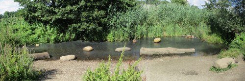 Am Wassererlebnisbereich der Wedeler Au fliesst es noch ein wenig – ein Großteil der sonst überflossenen Fläche besteht allerdings nun aus aufgeheiztem, trockenem Kies.